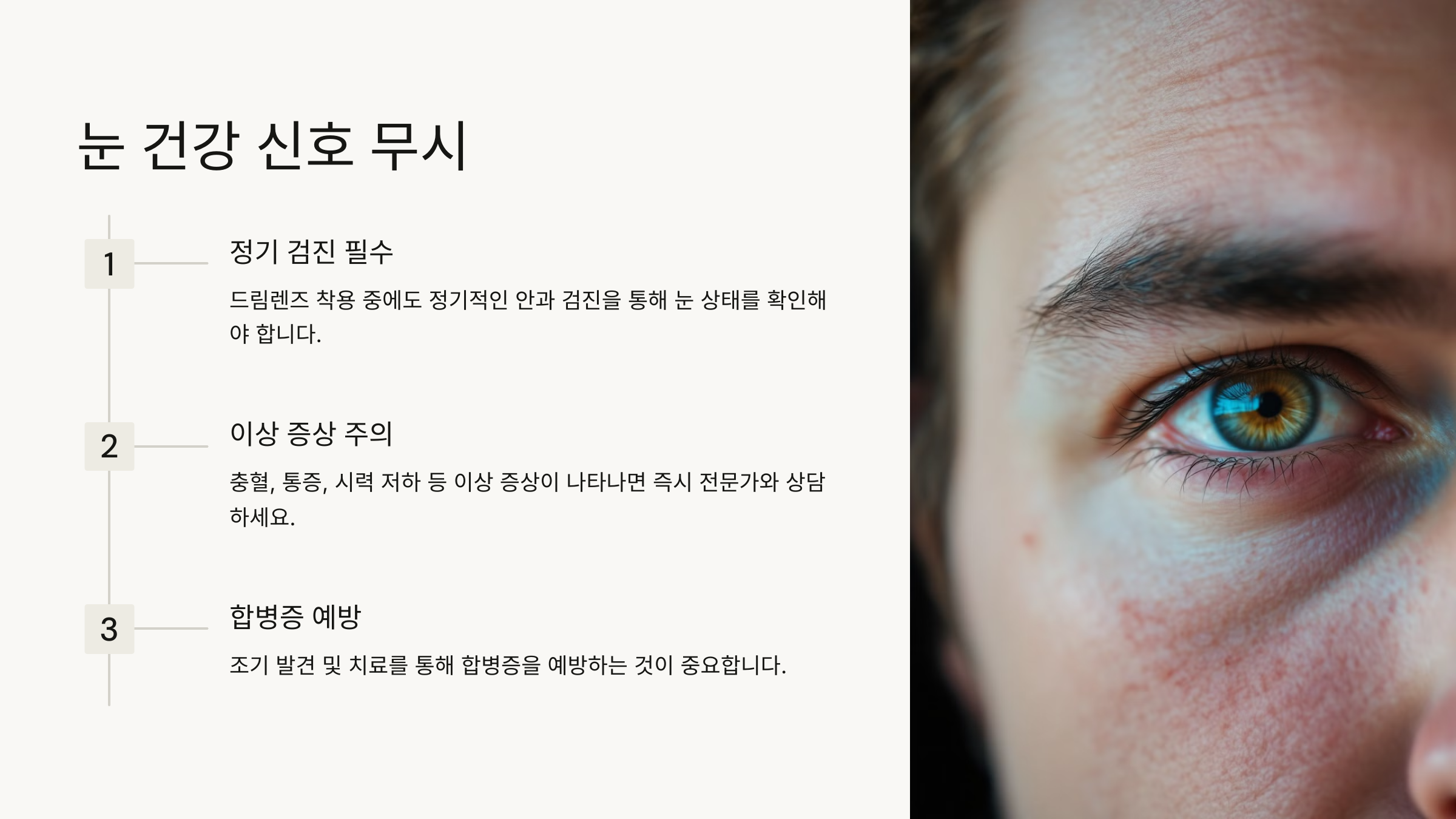 👀 해결 방법: 드림렌즈는 각막 곡률눈물층까지 고려해야 하기 때문에 반드시 안과에서 정밀 검사를 받고 맞춰야 해요!