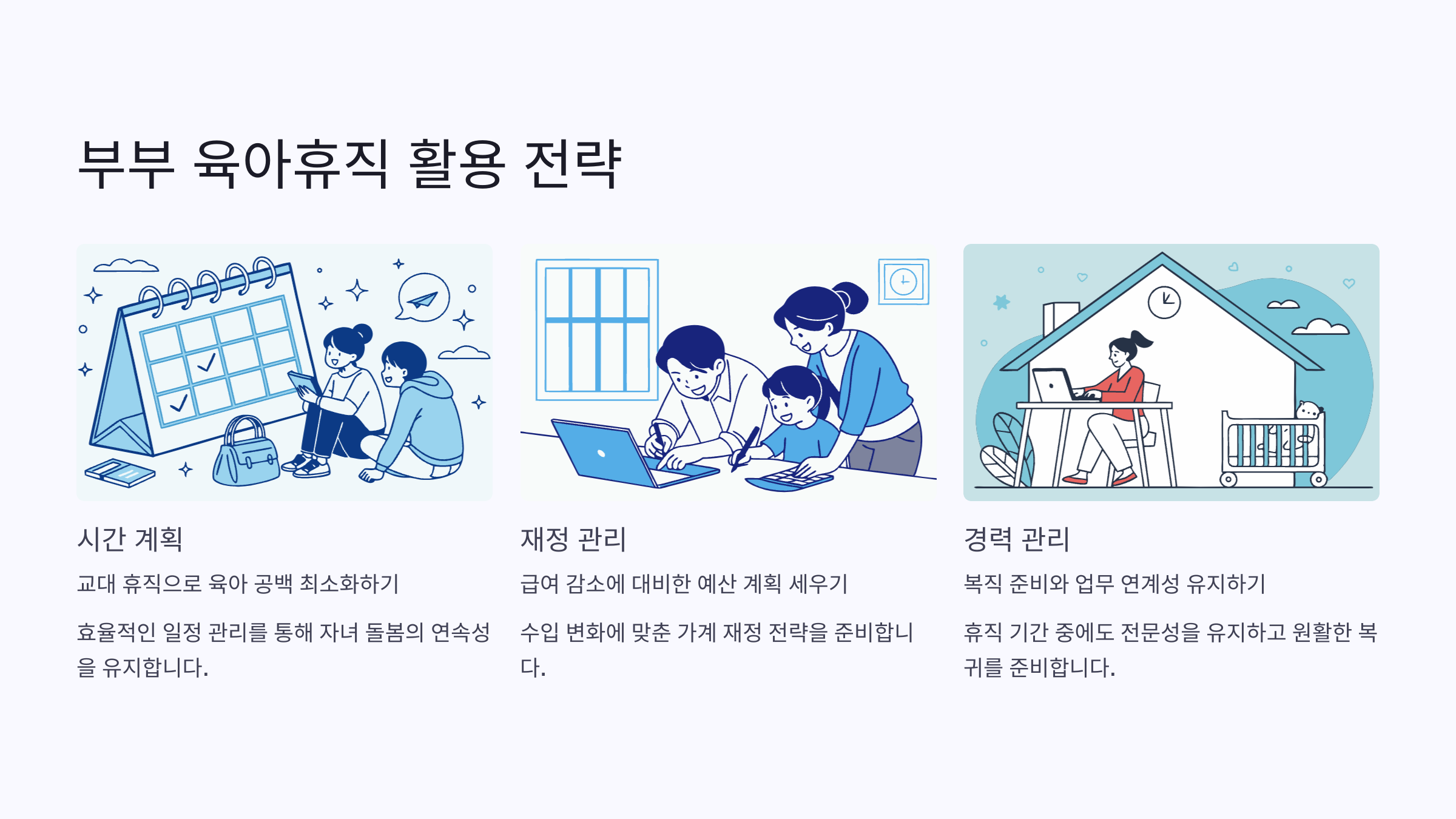 이 모든 걸 조율하려면 **부부 간 대화와 역할 분담**이 중요해요. 한쪽만 육아휴직을 맡기보다는 서로의 경력, 회사 상황, 육아 선호도를 고려해서 누가 먼저, 얼마나, 어떤 방식으로 사용할지 명확히 정하는 게 포인트예요 👨👩👧