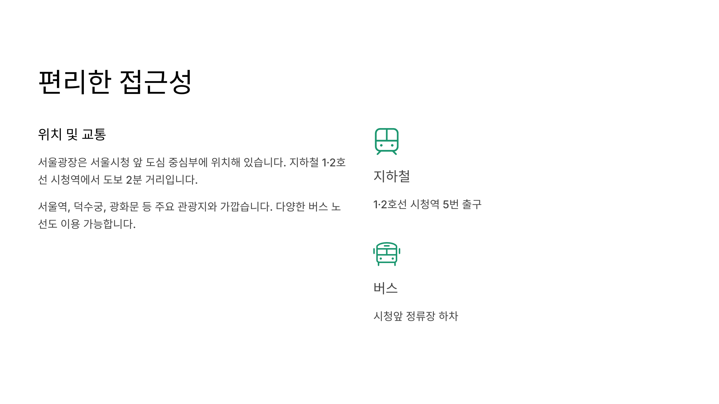 이제 이 멋진 공연들을 어디서, 어떻게 즐길 수 있을지! 다음 섹션에서 서울광장 위치와 교통 정보를 알려드릴게요~ 🚌🚇