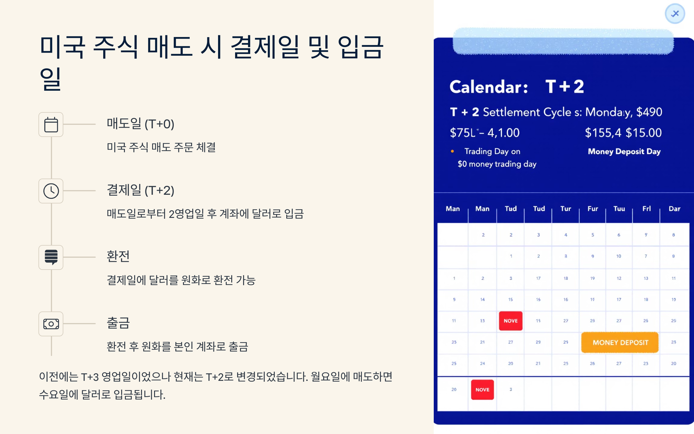 두 번째로 중요한 건 ‘매도 시점’이에요. 매도는 월요일~수요일 사이에 하는 게 가장 유리해요. 왜냐하면 결제일과 환전, 입금까지 고려했을 때 주말이나 공휴일 영향을 최소화할 수 있기 때문이죠. 목요일이나 금요일은 자연스럽게 전체 일정이 밀리게 되니까요.