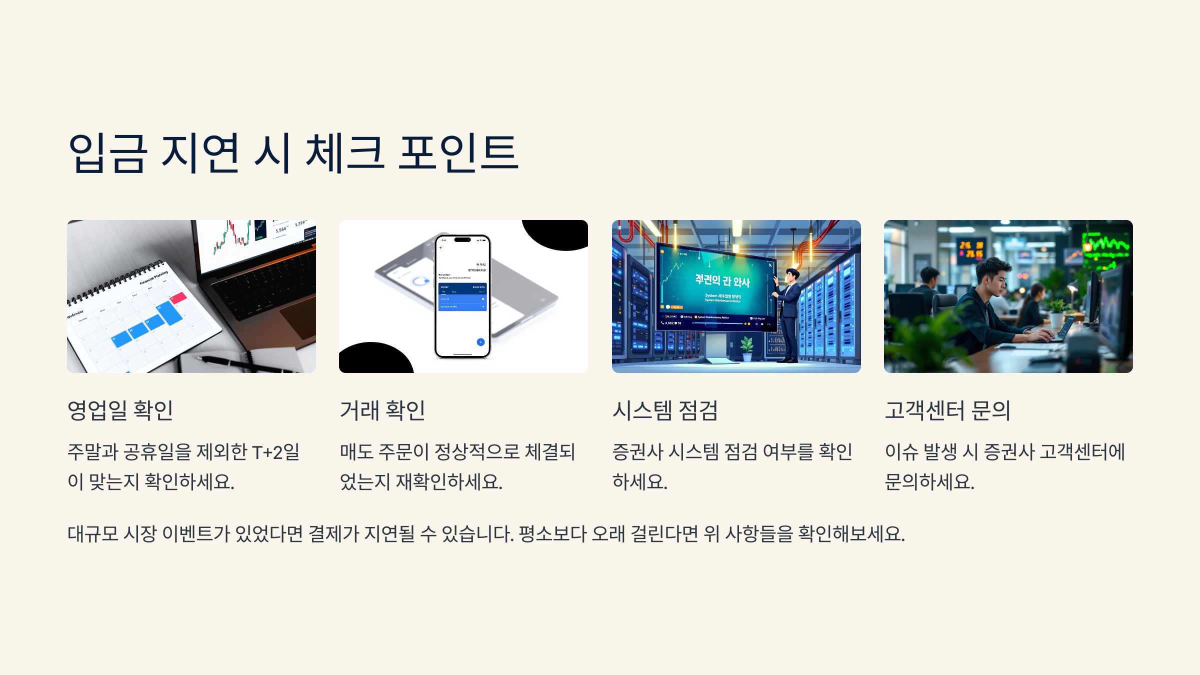 | 결제일 지났는가? | T+2 영업일 계산 | 달력 확인 필수 |