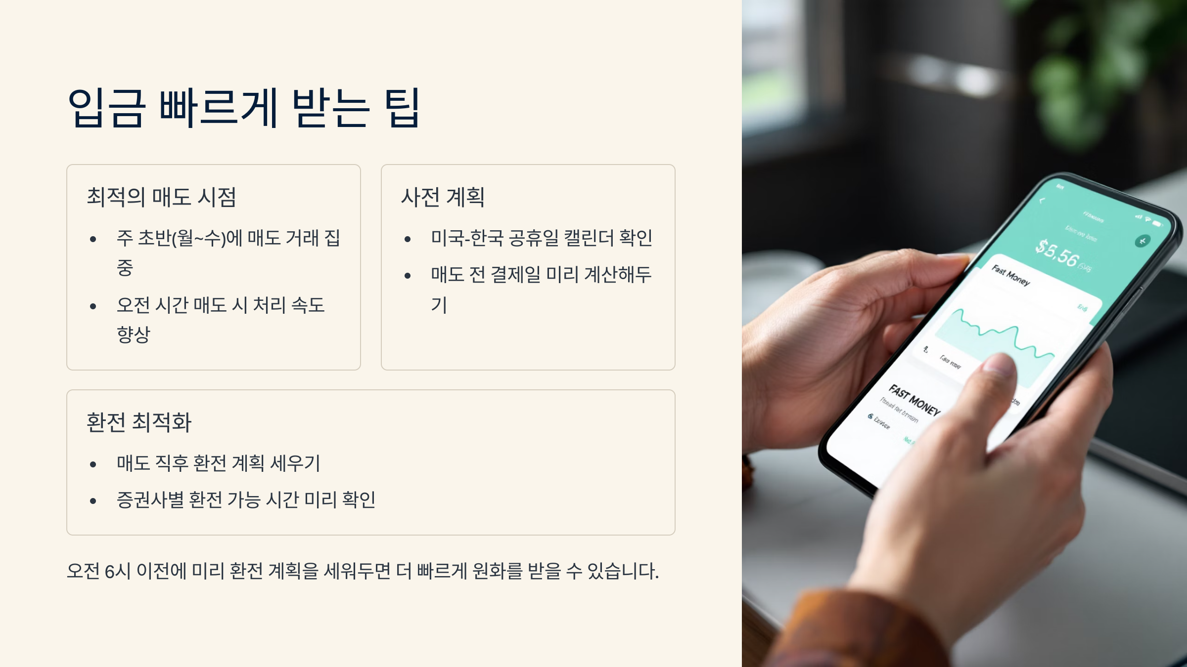 가장 먼저 고려할 수 있는 방법은 ‘자동 환전 설정’이에요. 증권사마다 자동환전 기능이 있어서, 결제일에 달러가 들어오면 바로 원화로 바꿔주는 시스템이 있답니다. 수동으로 환전하는 수고도 덜고, 입금 속도도 훨씬 빨라지죠.