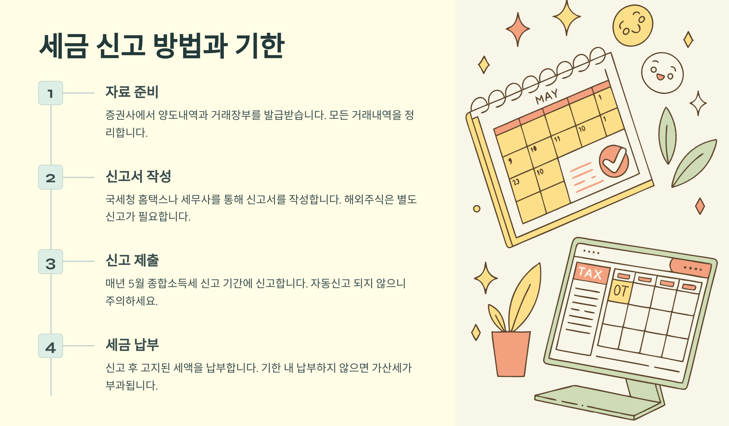 미국 주식 양도소득세는 익년 5월 1일부터 31일까지 국세청 홈택스에서 자진 신고해야 해요. 2025년에 미국 주식을 팔았다면 2026년 5월에 신고하고 세금을 납부하는 구조예요.