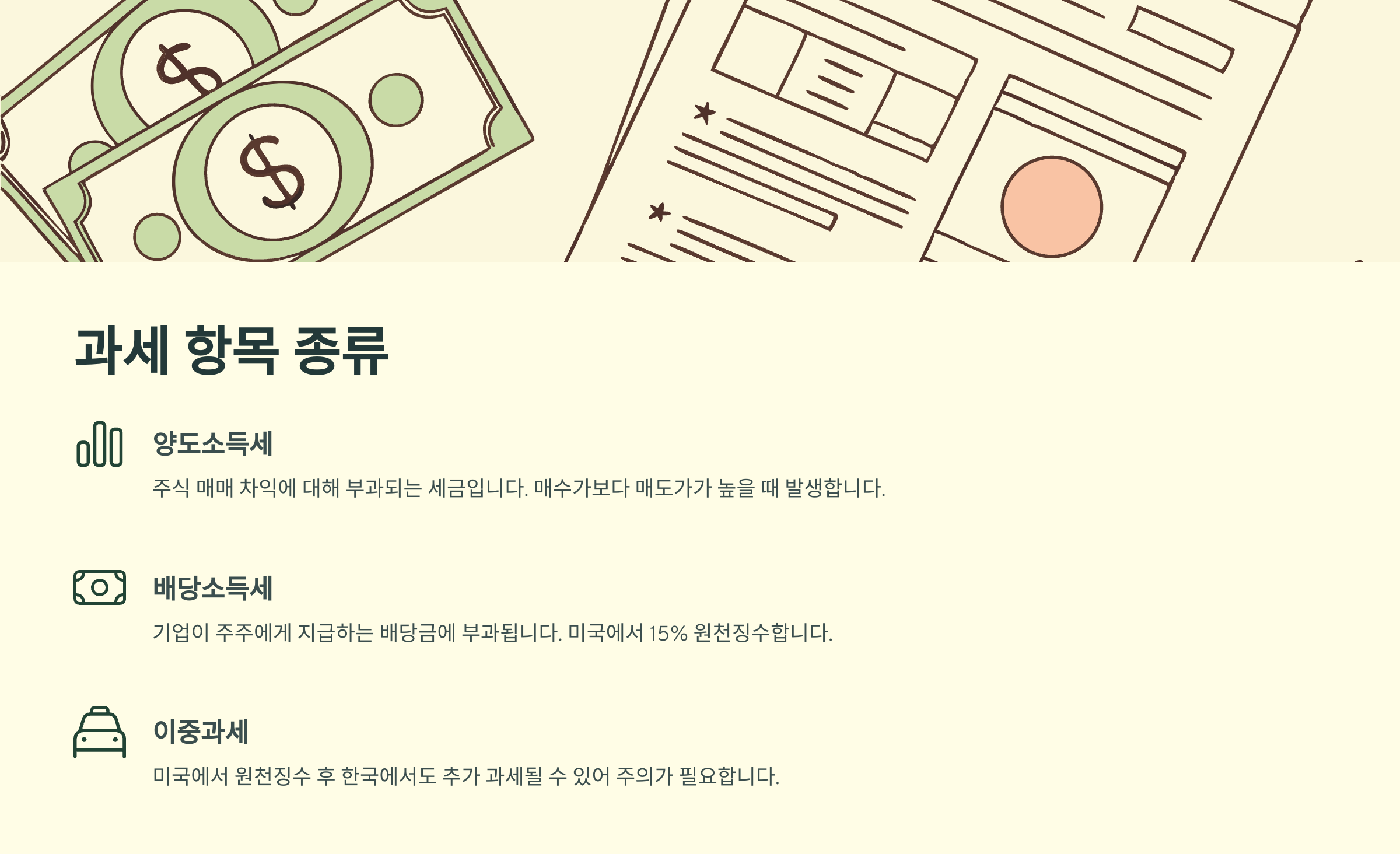 이제 미국 주식 투자 시 어떤 항목들이 과세되는지 하나하나 구체적으로 알아볼게요! 👇