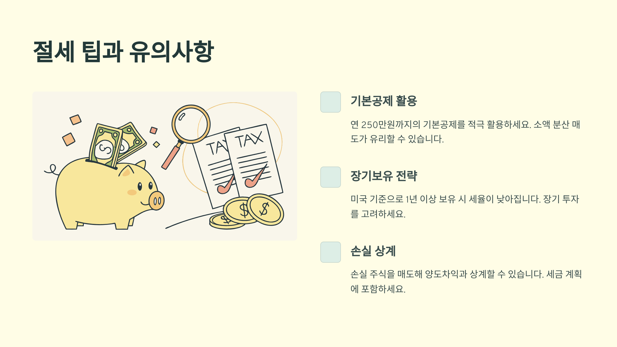1️⃣ 기본공제 250만 원을 활용하세요! 여러 종목을 쪼개서 전략적으로 매도하면 공제를 최대한 활용할 수 있어요. 연말 전 손절매도 고려해볼 만해요.