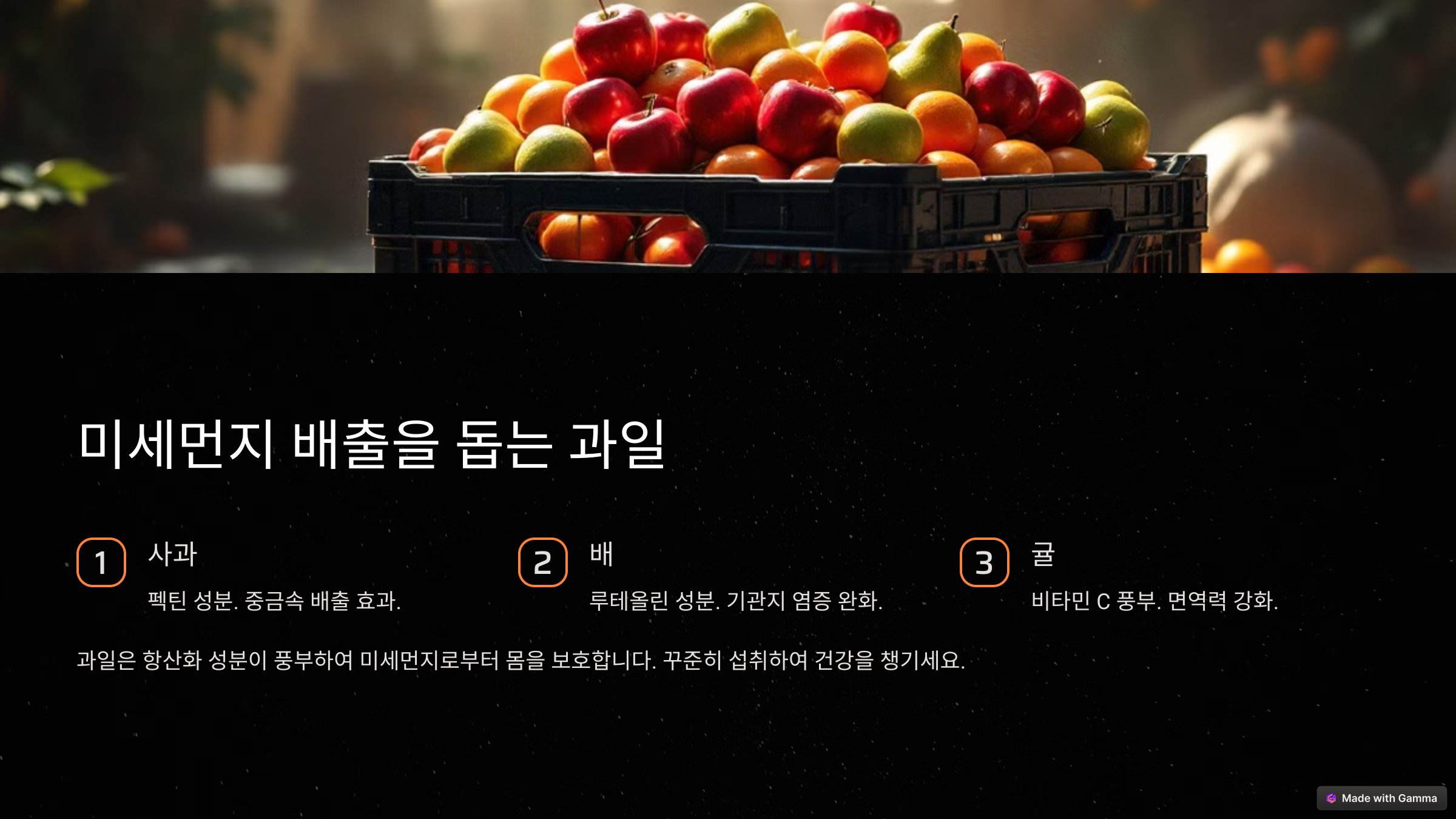 미세먼지가 심한 날에는 수분이 풍부하고 항산화 성분이 많은 과일을 섭취하는 것이 좋아요. 대표적인 해독 과일로는 배, 사과, 귤, 블루베리 등이 있어요.
