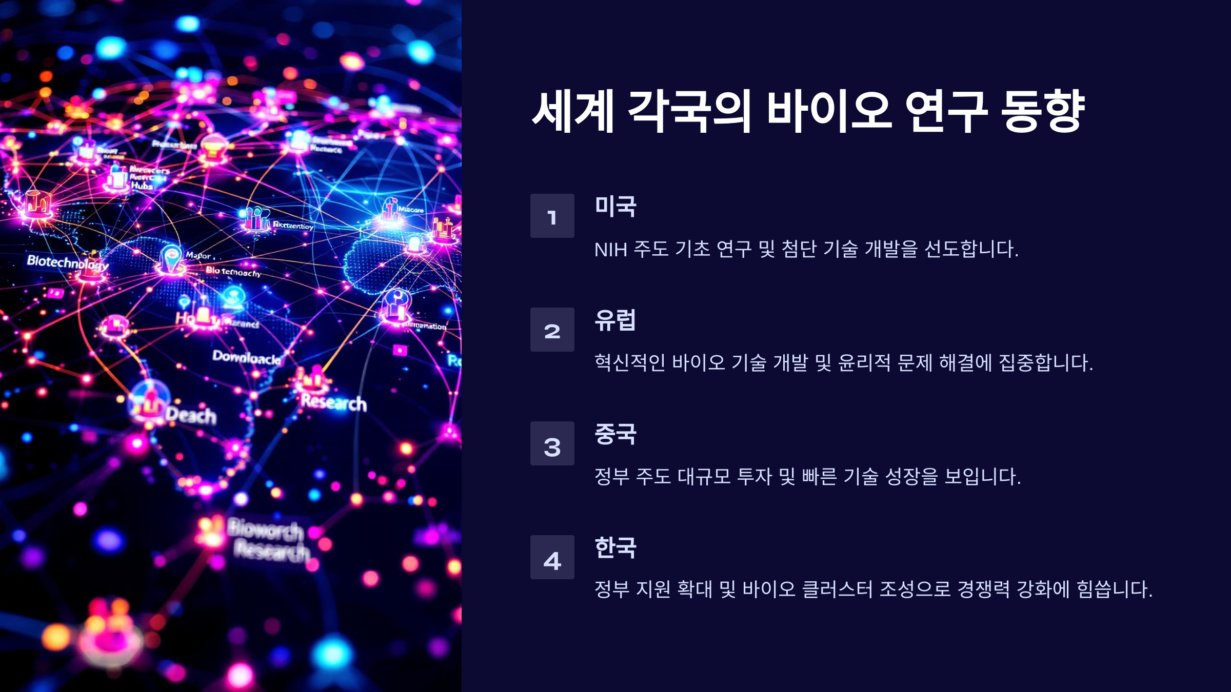 미국은 유전자 치료, 신약 개발, AI 기반 생명과학 연구에서 세계를 선도하고 있어요. 유럽은 재생의학과 환경 바이오 분야에 강점을 보이고 있고, 중국과 한국도 바이오 의약품과 맞춤형 의료 기술에서 빠르게 성장하고 있죠. 🚀