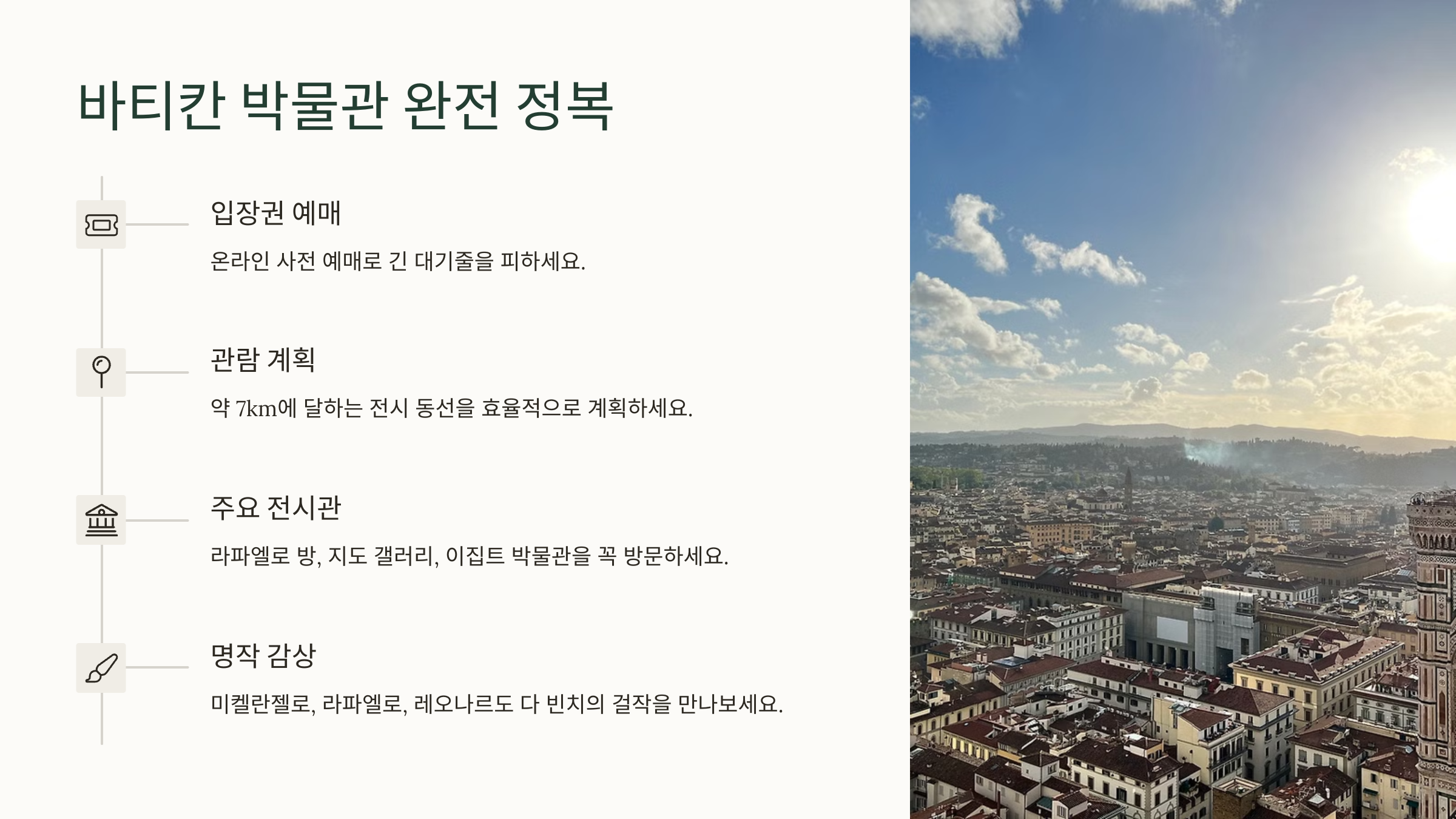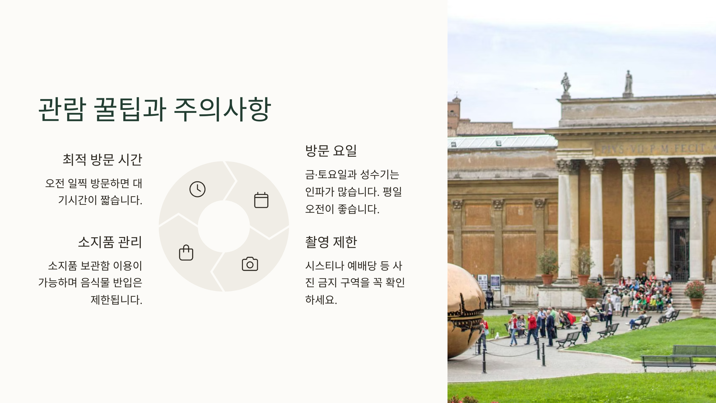 다음은 바티칸 여행을 200% 즐기기 위한 **관람 꿀팁과 주의사항**을 알려드릴게요! 줄 안 서고 입장하는 법도 포함되어 있어요!