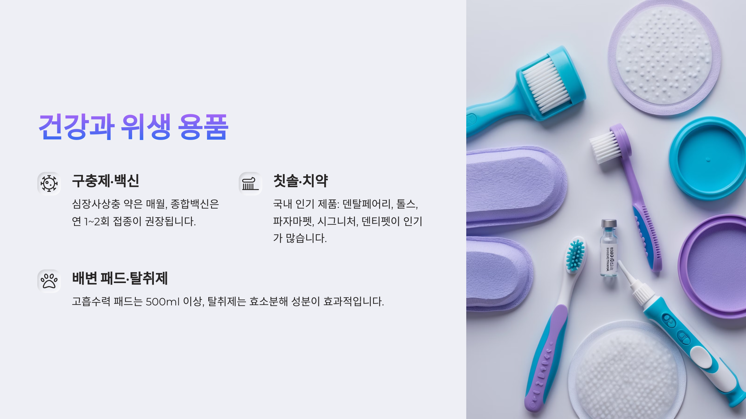 이 기본템만 잘 갖춰도 입양 초기의 시행착오를 크게 줄일 수 있어요. 처음부터 너무 많은 걸 사기보단, 꼭 필요한 것들부터 차근차근 시작하는 게 좋아요. 그럼 다음은 건강과 위생을 위한 용품들, 하나씩 살펴볼게요!
