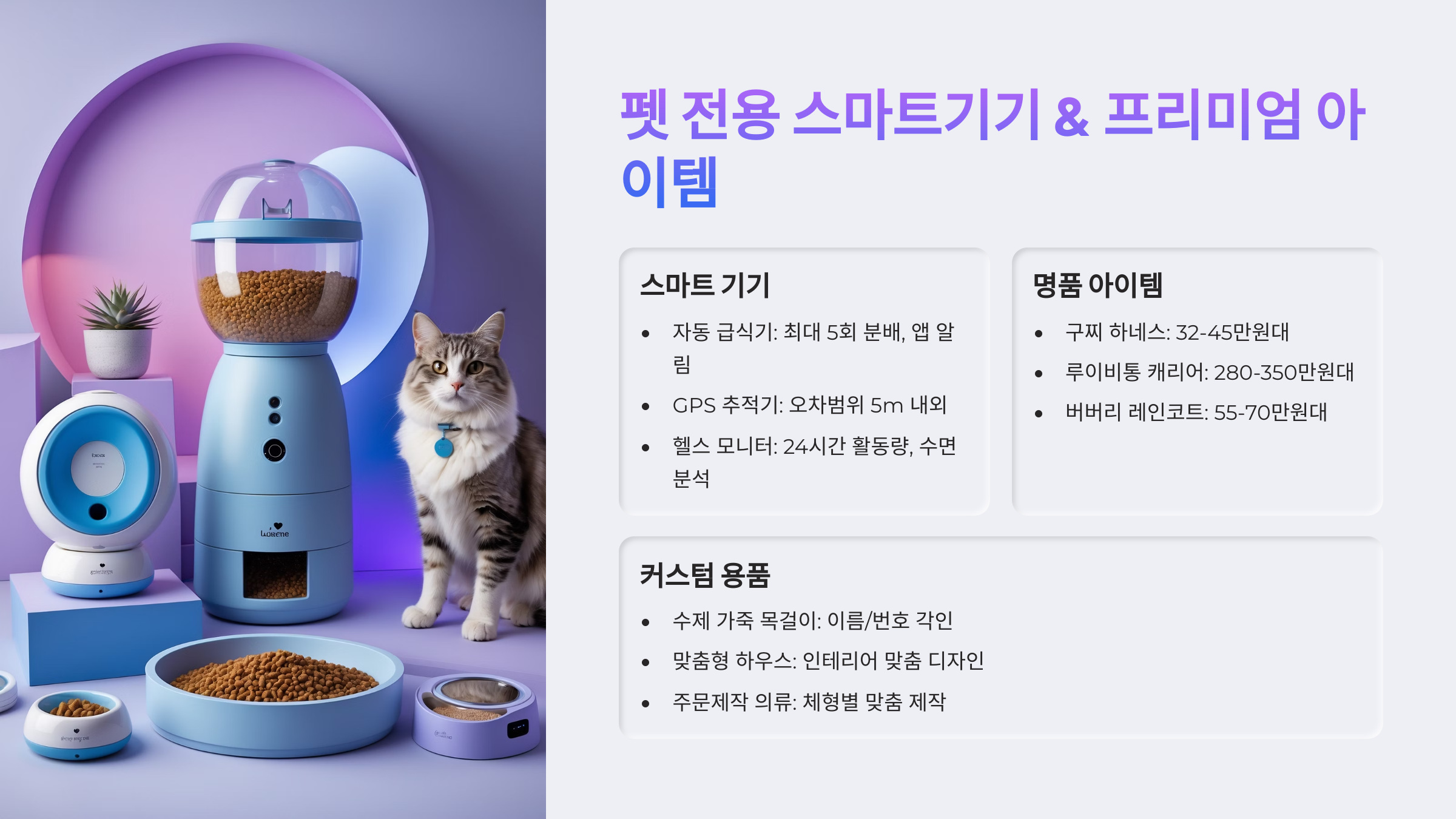 이런 프리미엄 아이템들은 꼭 필요하지 않을 수 있지만, 반려동물과의 삶을 더 특별하게 만들 수 있어요. 감성적 만족도도 높고, 나만의 방식으로 아이에게 최고의 생활을 선물하고 싶을 때 한 번쯤 고려해볼 만한 선택이에요!