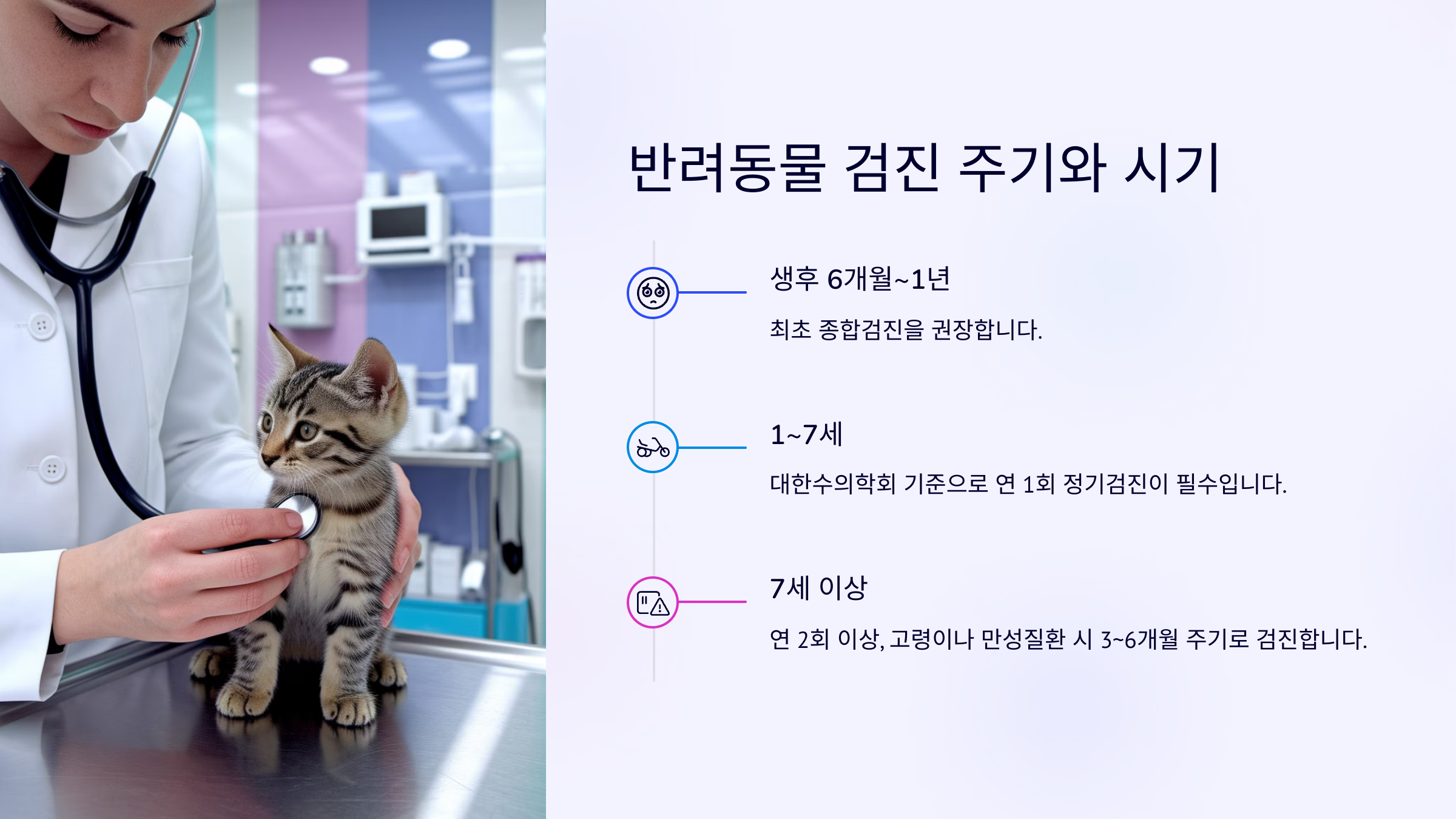 일반적으로 **1세~6세 사이의 건강한 반려동물**은 1년에 한 번, **7세 이상 노령기 반려동물**은 6개월에 한 번 이상 정기 검진이 권장돼요. 특히 노령기에는 혈액검사, 장기 초음파, 심장 검사 등을 꼭 포함해야 해요.