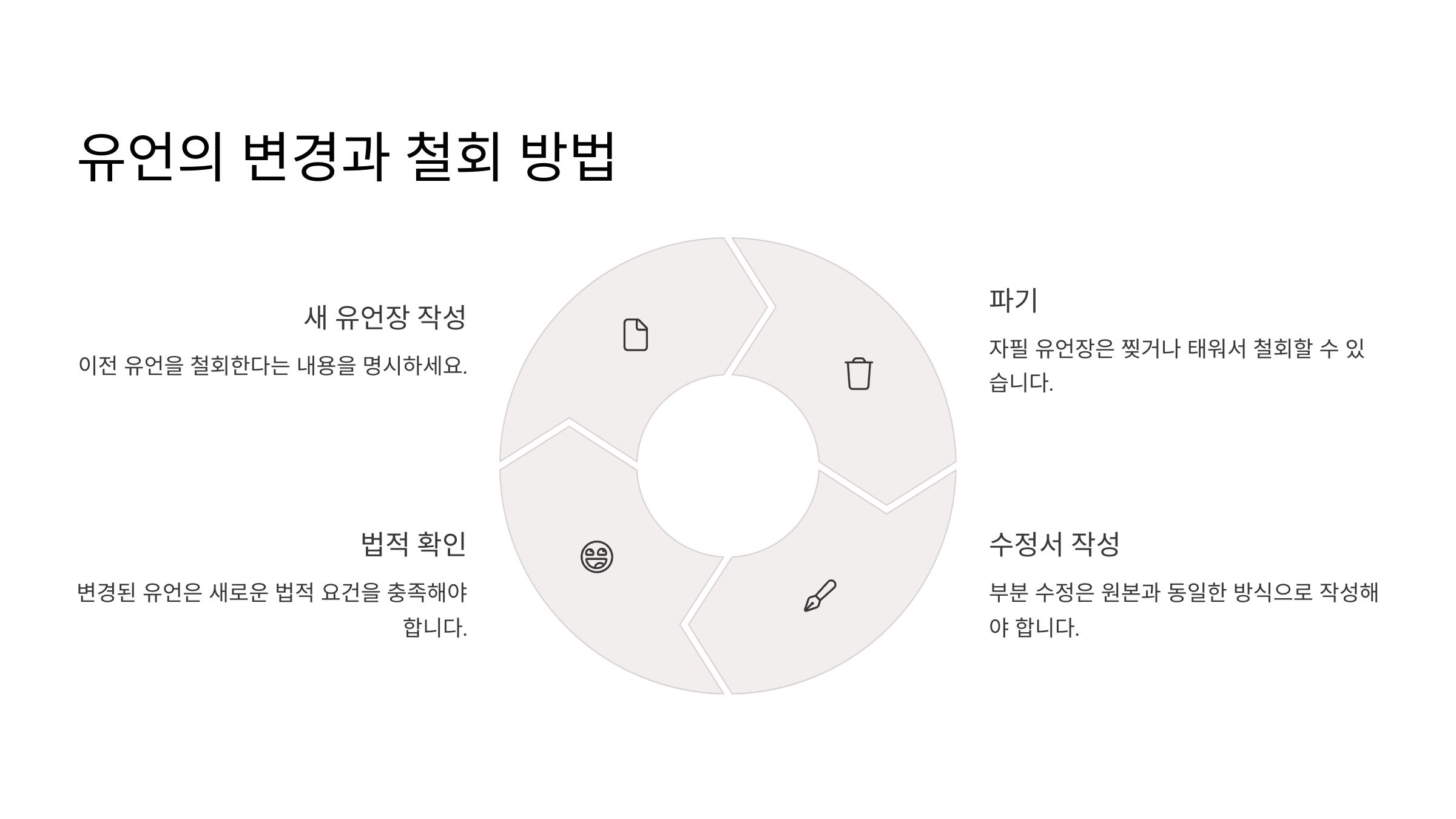 | 변경 방법 | 새 유언장 작성 (형식 요건 충족 필수) |