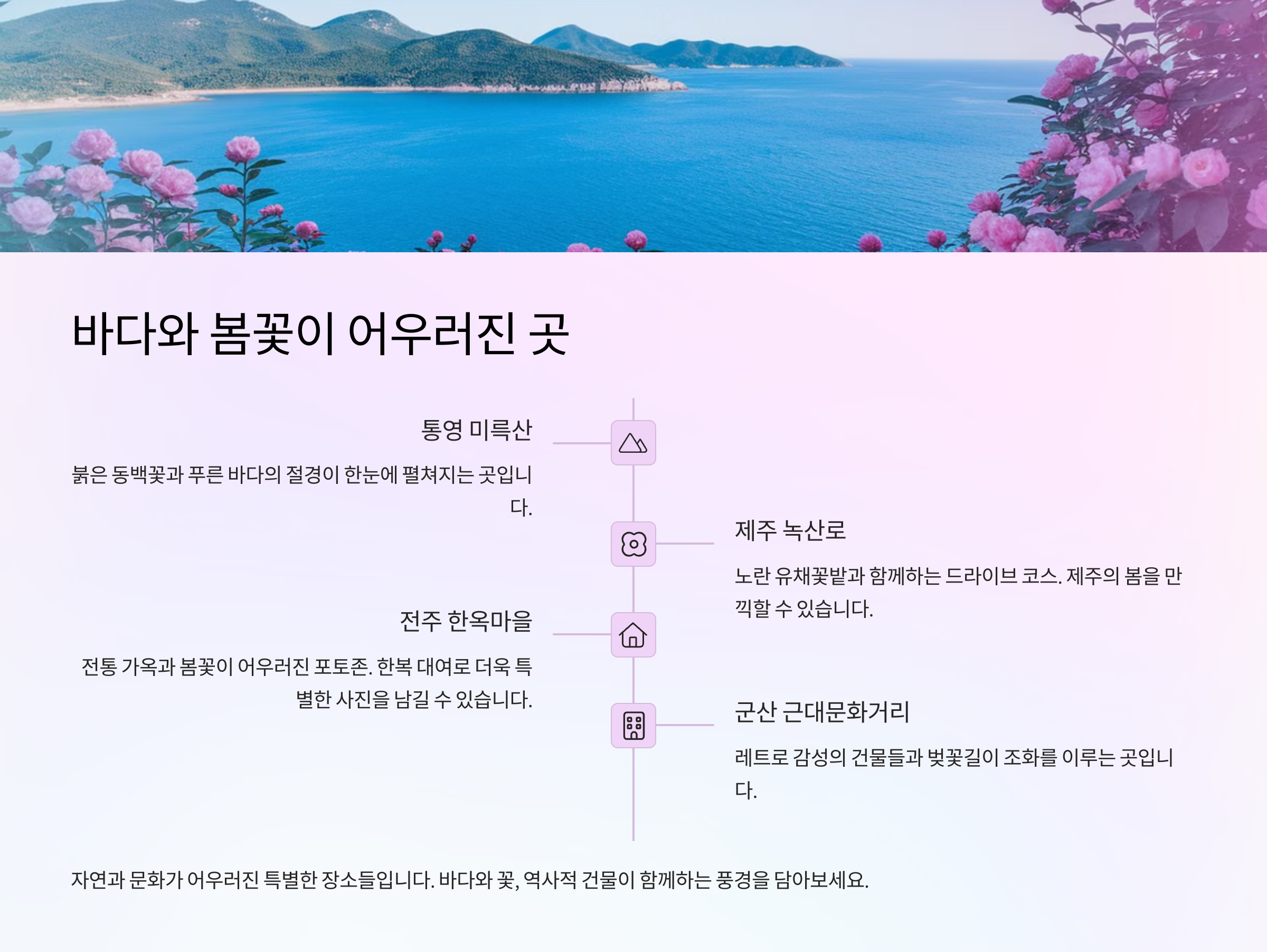 | 경남 | 진해, 통영 | 벚꽃+바다+골목길 |