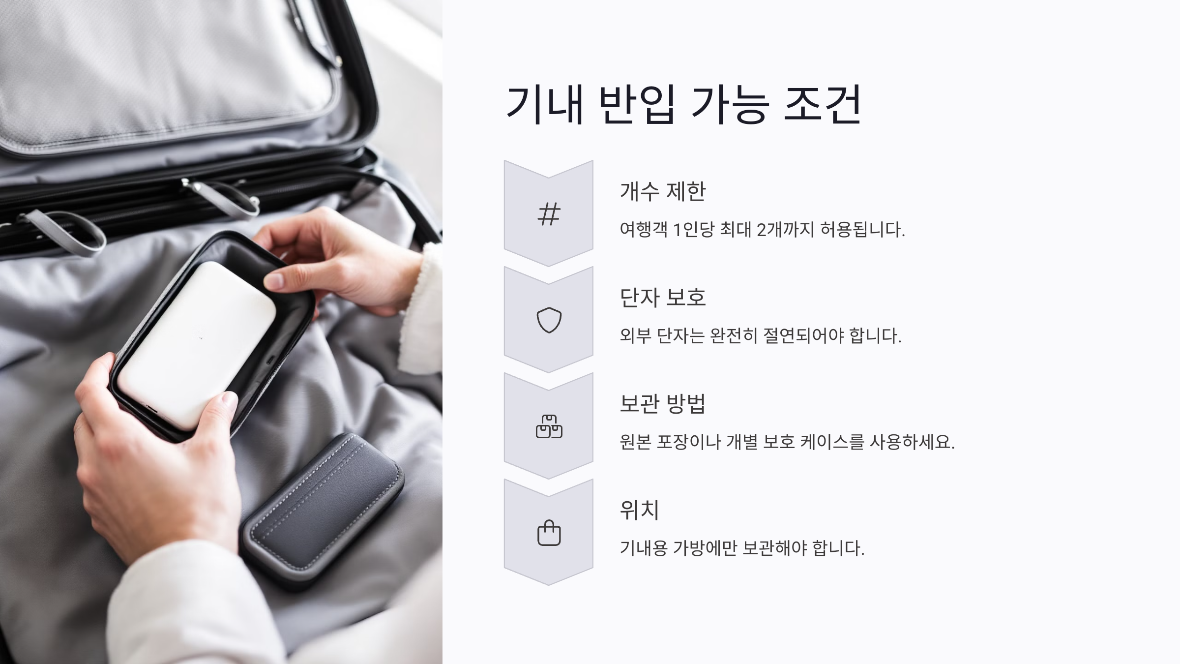 보조배터리를 기내에 가져가려면 단순히 “100Wh 이하”라는 용량만 맞추면 될까요? 실제로는 그보다 더 다양한 조건이 있어요. 공항 보안 검색대에서는 배터리의 외관, 포장 방식, 개수까지 모두 확인하거든요. 규정을 하나라도 어기면 반입 불가로 바로 압수 당할 수 있어요.