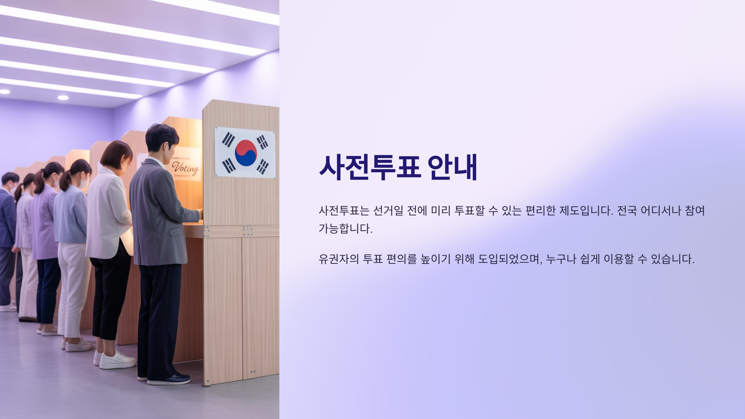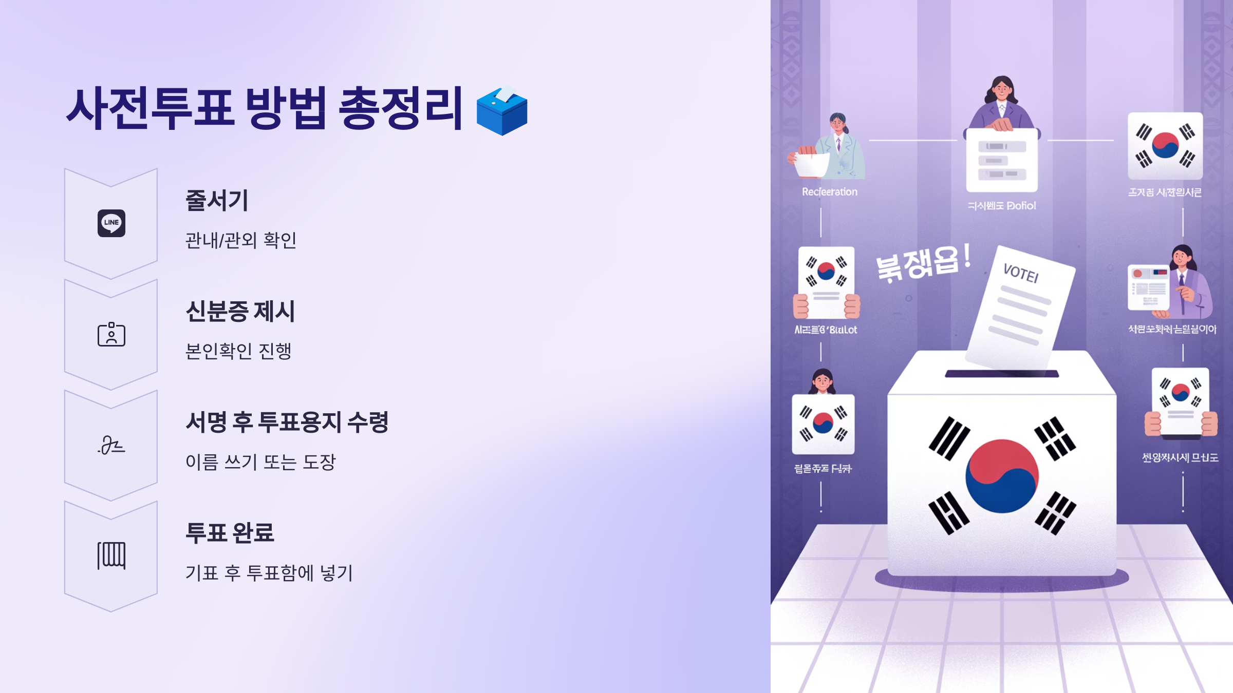 지금부터는 사전투표에 대해 꼭 알아야 할 내용을 하나씩 친절하게 알려드릴게요. 이 글만 읽어도 실수 없이, 빠르게, 똑똑하게 사전투표를 마칠 수 있도록 도와줄게요! 😊