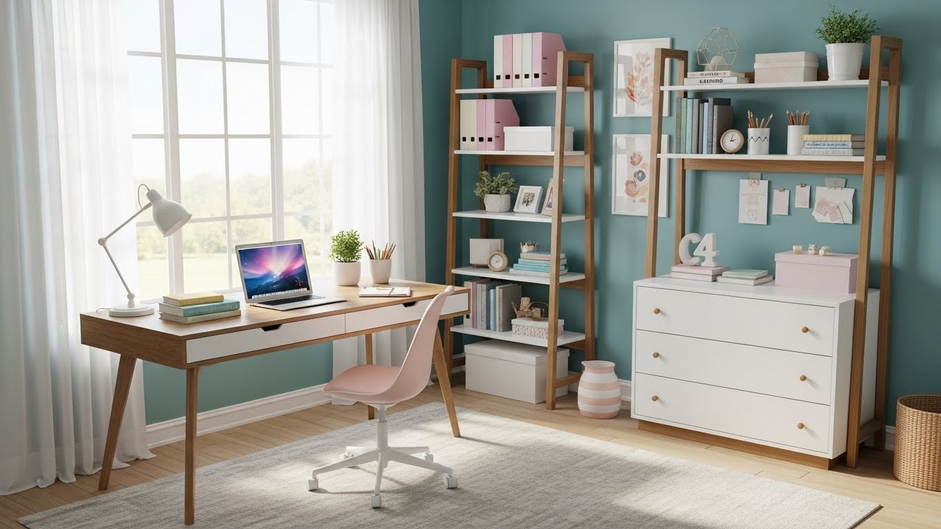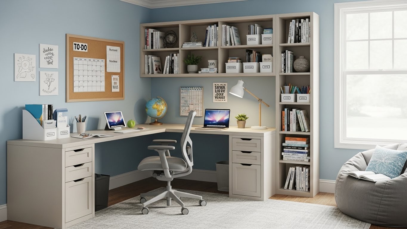 공부 구역엔 자연광이 들어오는 창가 쪽이나, 산만하지 않은 벽면을 활용하는 게 좋아요. 의자는 너무 편하지 않게, 허리를 바로 세울 수 있는 디자인이 좋아요. 집중력이 떨어지지 않거든요. 📚