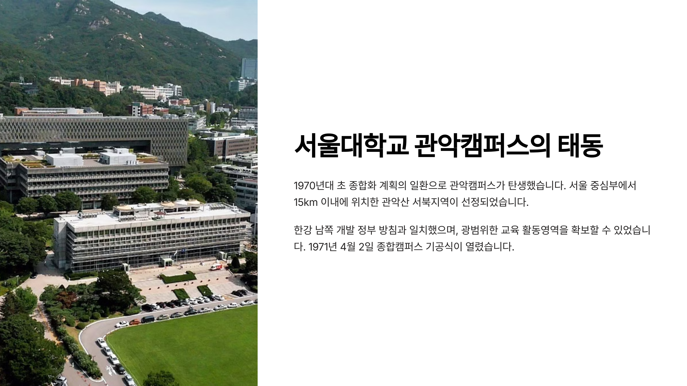 이전 당시 가장 강조되었던 키워드는 ‘통합’과 ‘자연과의 조화’였어요. 서울대의 상징인 관악산과 어우러지는 친환경적 캠퍼스를 만들고자 했고, 각 단과대학의 기능과 성격을 고려해 구획을 나누는 작업이 이뤄졌죠. 이로 인해 지금의 서울대 캠퍼스는 거대한 지식 도시처럼 형성됐답니다.