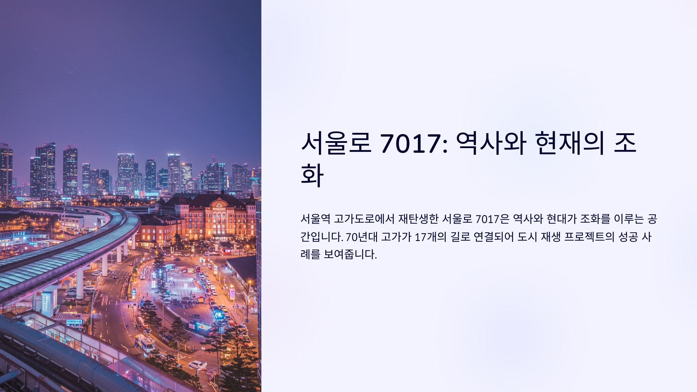 서울로 7017은 단순한 고가도로가 아니에요. 1970년에 만들어진 서울역 고가도로가 2017년에 사람을 위한 산책길로 변신하면서 ‘7017’이라는 이름을 얻었죠. 숫자에는 각각 의미가 담겨 있어요. 70년대의 시작과 17년에 재탄생한 이 상징적인 공간은, 이제는 서울의 대표적인 도시 재생 프로젝트로 자리 잡았답니다.
