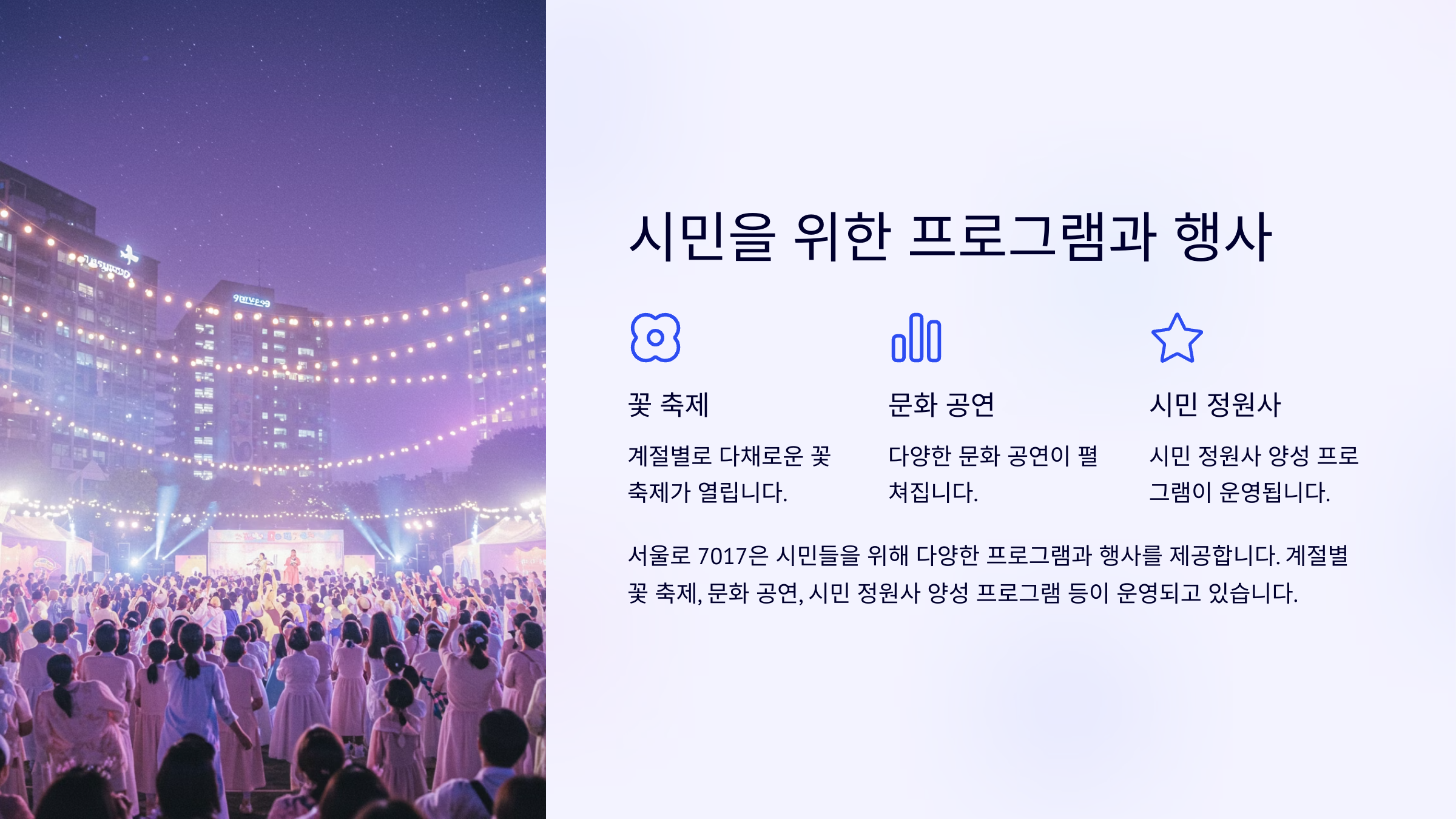 이런 명소들은 서울로를 단순한 산책길이 아닌 '경험의 공간'으로 만들어줘요. 걷다 보면 어느새 서울의 옛 정취와 새로운 도시 문화를 동시에 느끼게 되죠. 다음은 시민들을 위한 서울로의 다양한 프로그램과 행사들을 소개할게요!