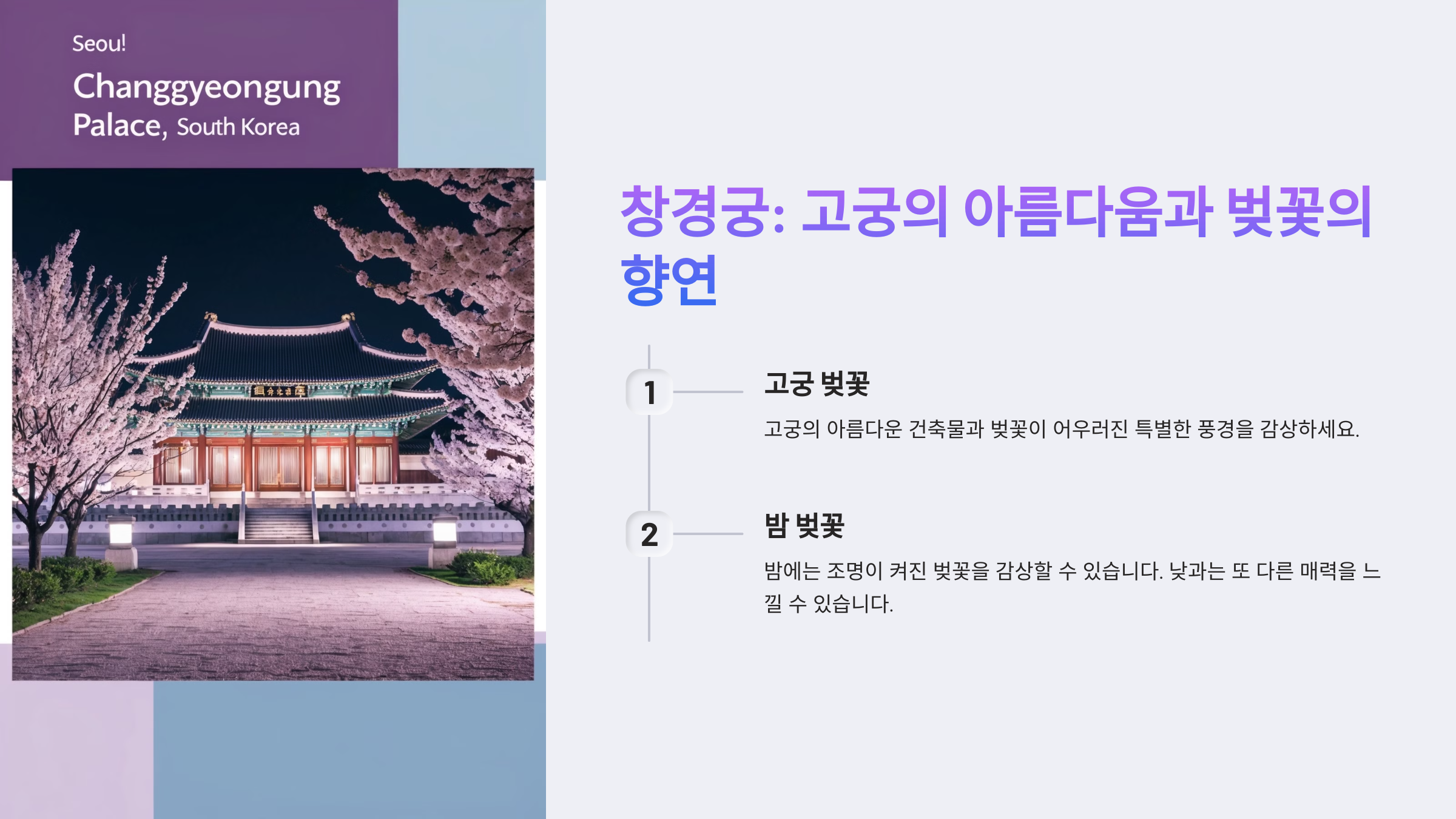창경궁에서 벚꽃을 보면 한국적인 정취를 느낄 수 있어요. 한복을 입고 방문하면 더 특별한 봄날을 보낼 수 있답니다! 🎎🌸
