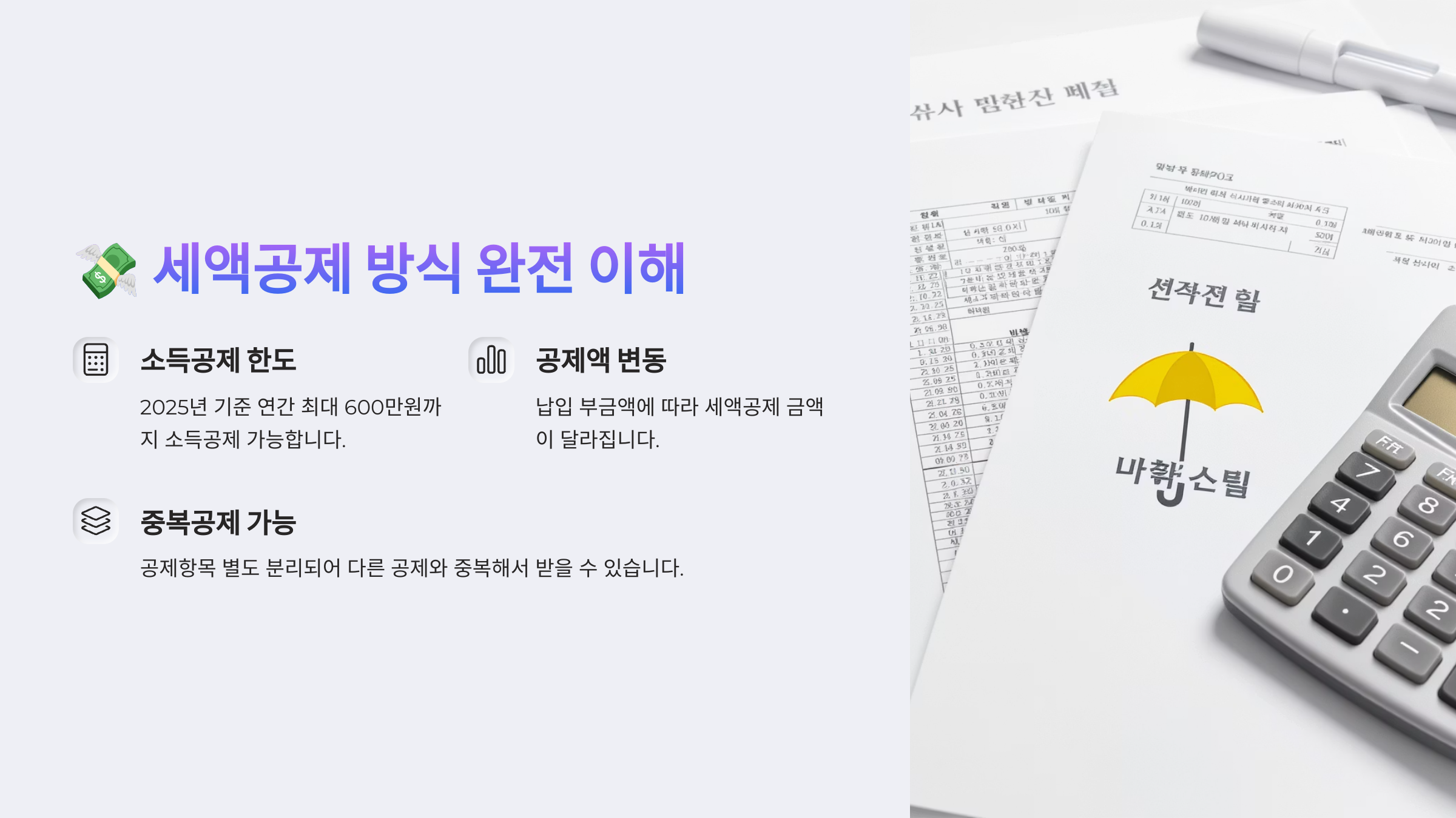이와 달리 세액공제는 세금에서 일정액을 빼주는 방식이라, 소득공제 방식이 훨씬 더 효과가 크다는 걸 알 수 있어요. 노란우산은 소득공제이기 때문에 실질 세부담 완화에 강해요.