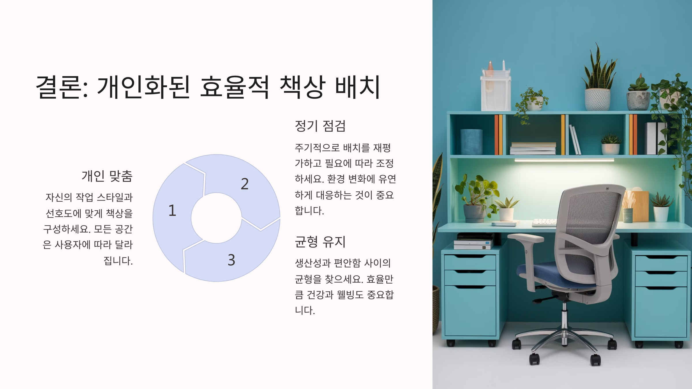 내가 생각했을 때, 올바른 책상 배치는 공간 활용과 심리적 안정감을 동시에 고려해야 해요. 자연 채광, 인체공학적 배치, 그리고 디지털 기기와의 조화까지 신경 쓴다면, 학습 환경이 훨씬 쾌적해질 거예요.