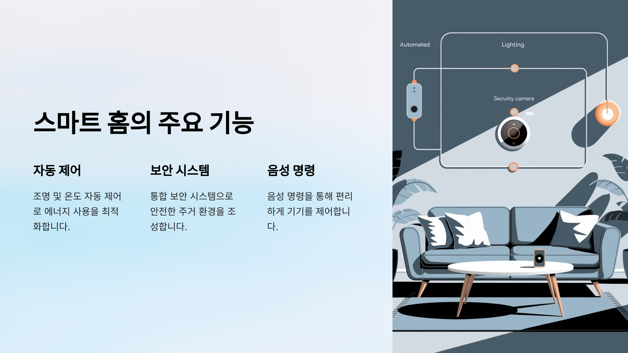 스마트 홈 시스템을 도입하면 **집 안의 모든 기기를 스마트폰, 음성 명령, 센서 등을 이용해 제어**할 수 있어요. 🌟