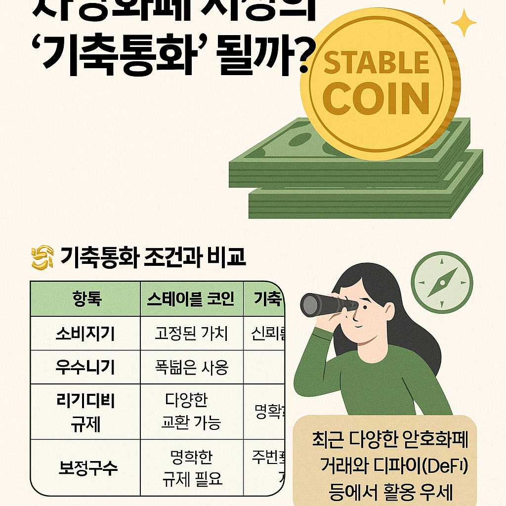 내가 생각했을 때, 스테이블 코인은 디지털 시대의 ‘인터넷 현금’ 같은 존재예요. 가치는 고정되어 있고, 사용은 빠르며, 국경을 넘어요. 기축통화가 되느냐 마느냐를 떠나, 이미 새로운 시대의 통화로 작동하고 있다는 점은 부정할 수 없어요.