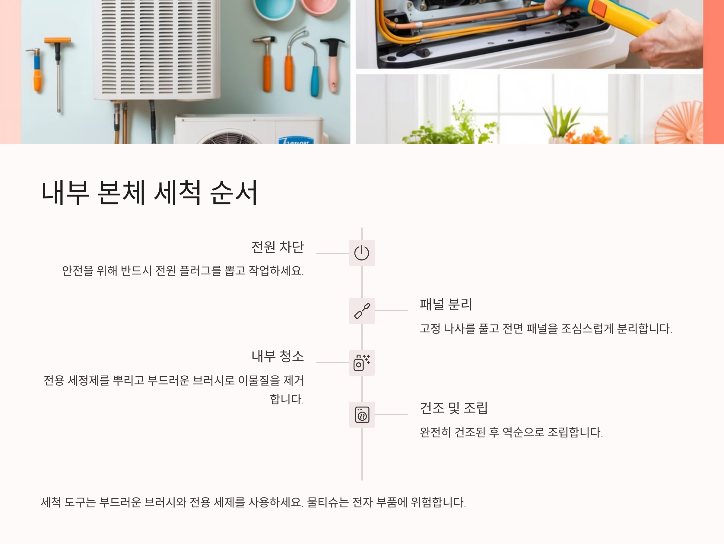 내부 본체 청소에서는 열교환기, 송풍팬, 드레인 팬 등 주요 부품을 다뤄야 해요. 이어지는 섹션에서 단계별로 아주 자세히 알려줄게요!