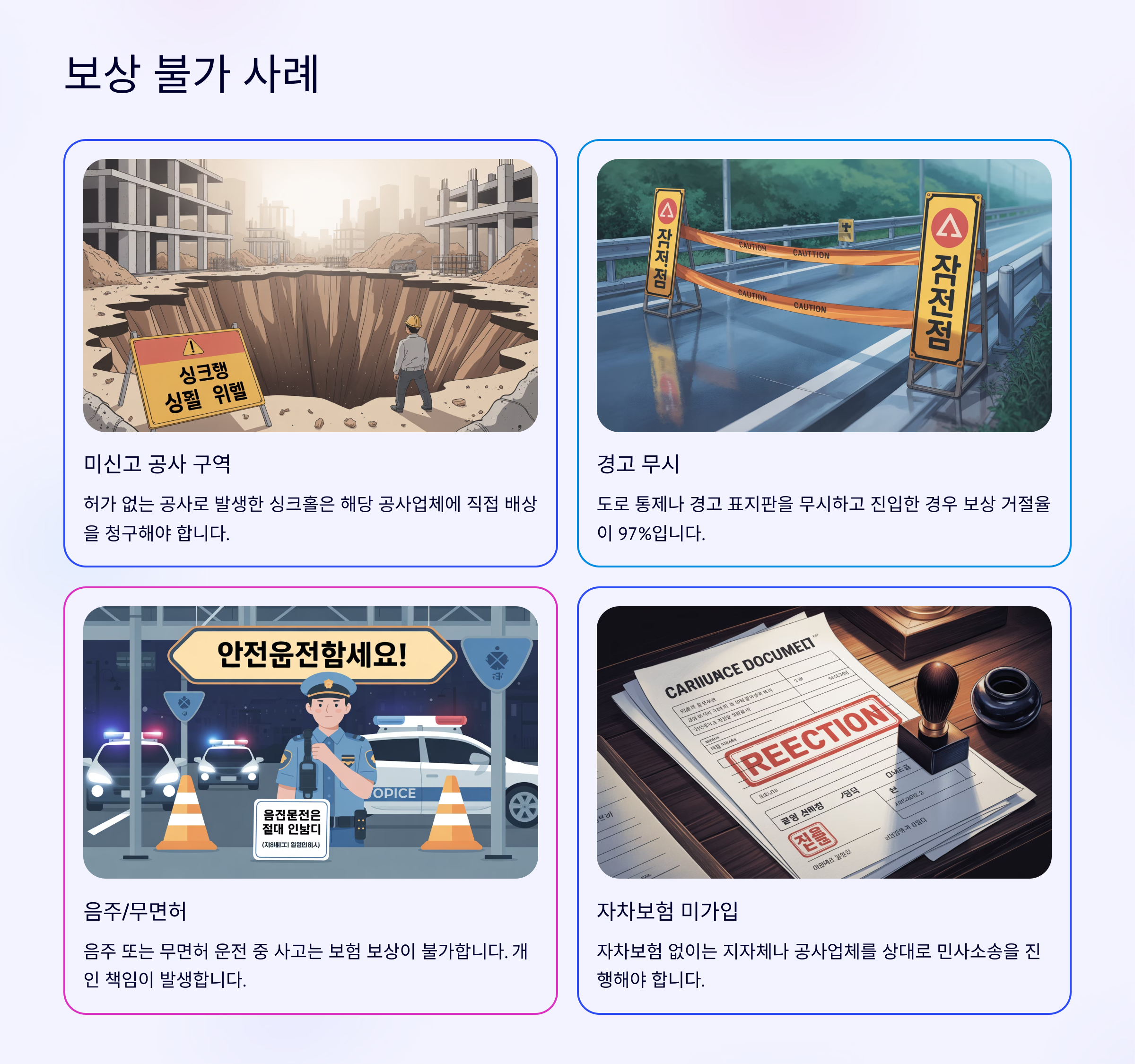 다음으로는 어떤 경우에 보험사에서 보상을 거절하는지, 즉 ‘보상 불가 사례’를 알아볼게요!