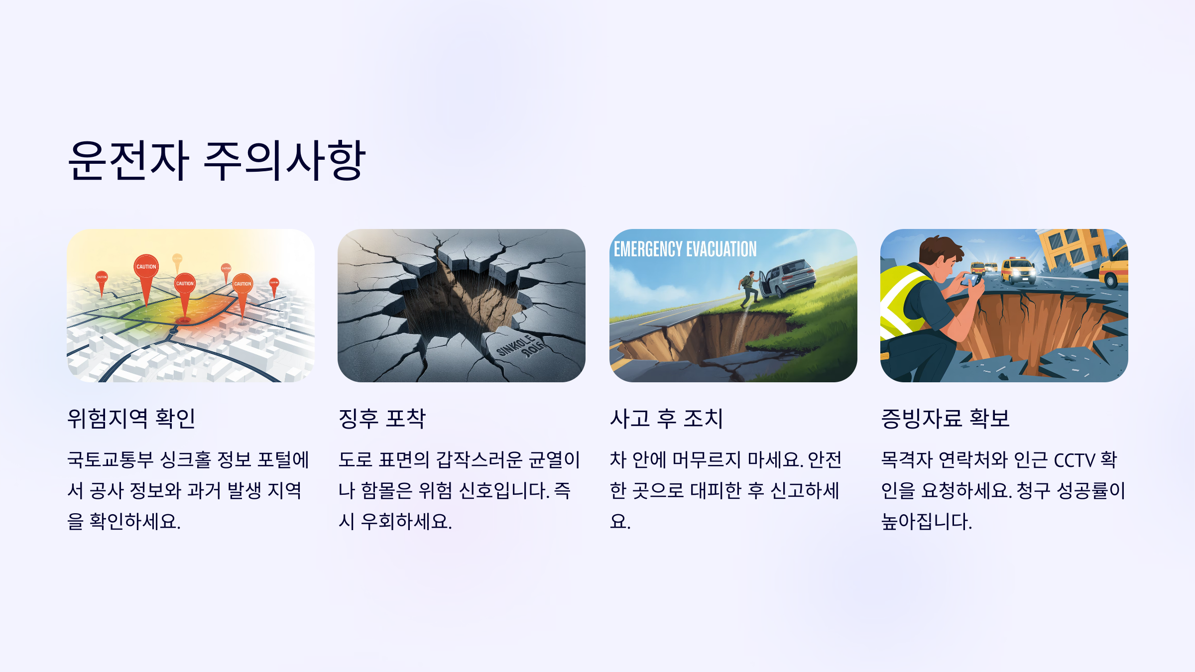 이제 마지막으로, 싱크홀 사고를 예방하거나 피해를 줄이기 위해 운전자들이 실천할 수 있는 주의사항들을 정리해볼게요!