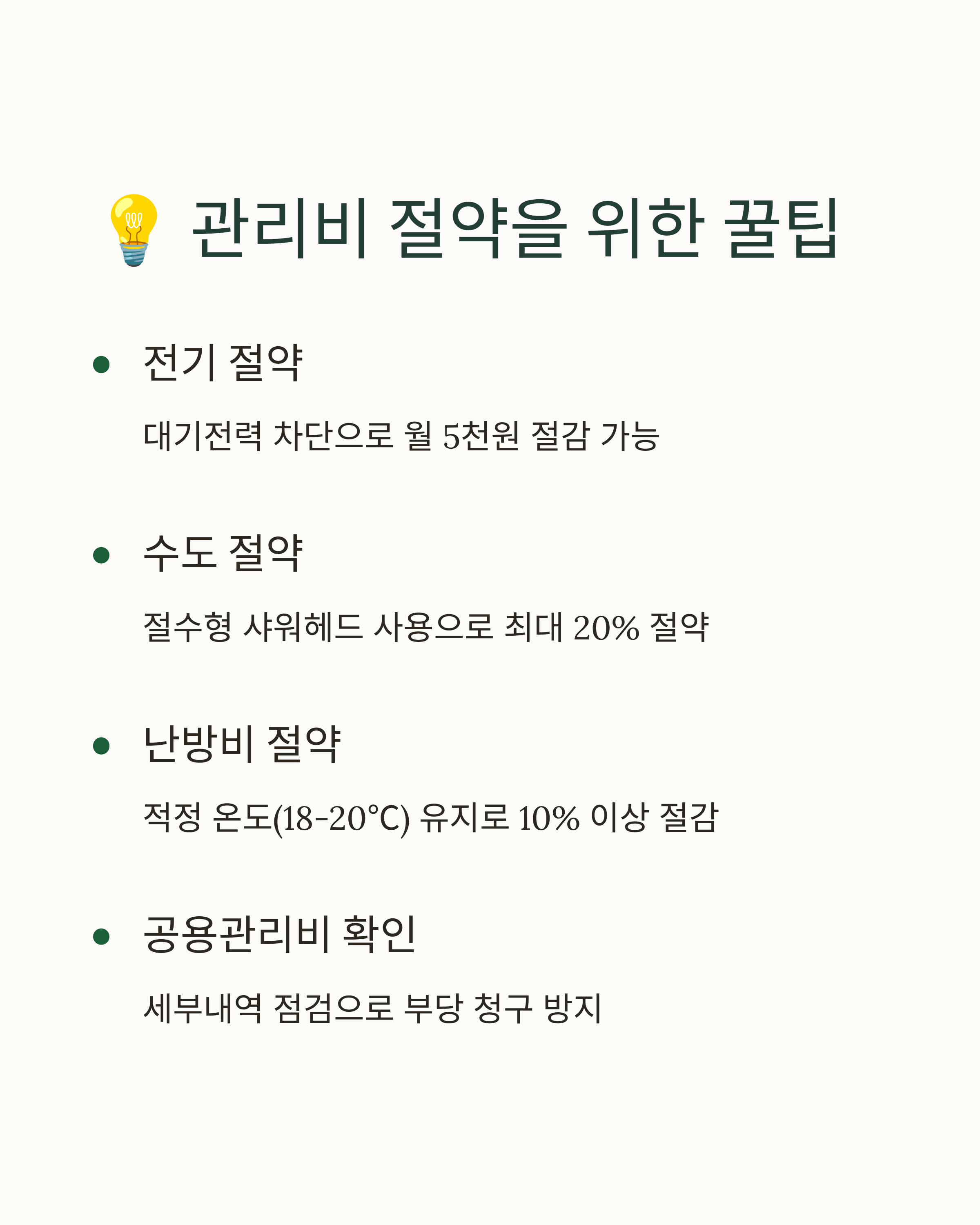 관리비를 줄이려면 무엇보다 사용량을 정확히 파악하는 게 중요해요. 전기와 수도 요금은 대부분 사용량에 따라 차등 적용되기 때문에, 자투리 낭비만 줄여도 상당한 절약이 가능하답니다.