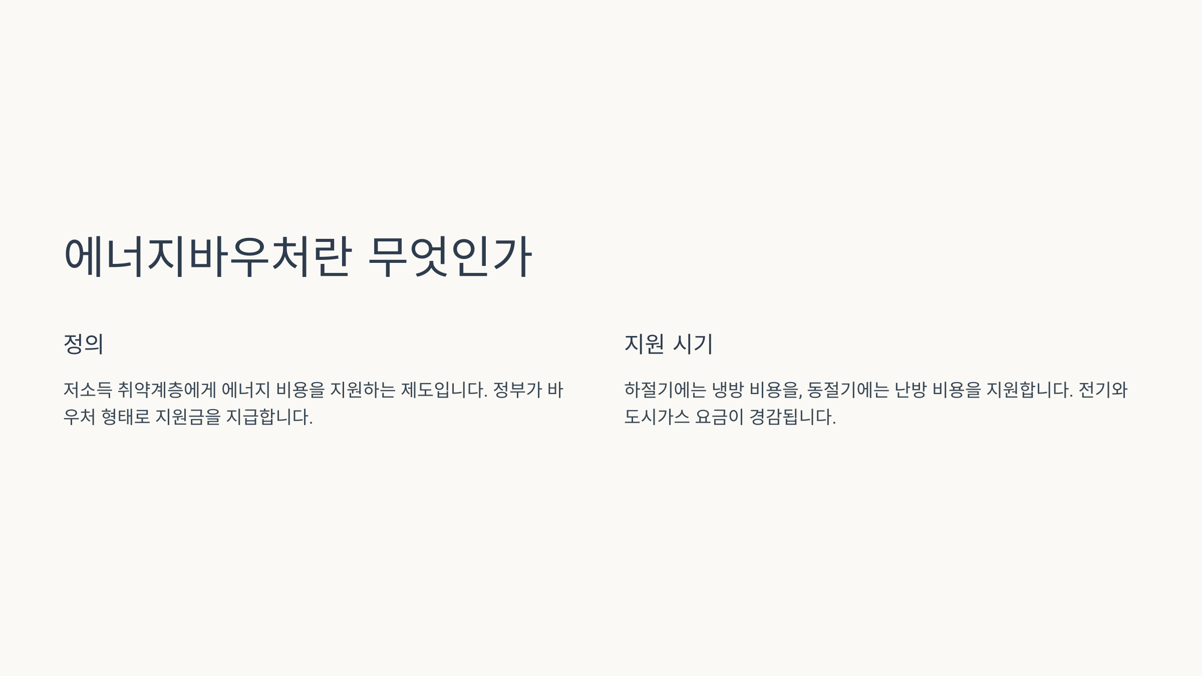 에너지바우처는 에너지 취약계층이 전기, 가스, 연탄 등 에너지 비용을 지원받을 수 있도록 도와주는 복지 제도예요. 보건복지부와 산업통상자원부가 함께 시행하고 있고, 2015년부터 본격 도입됐죠.