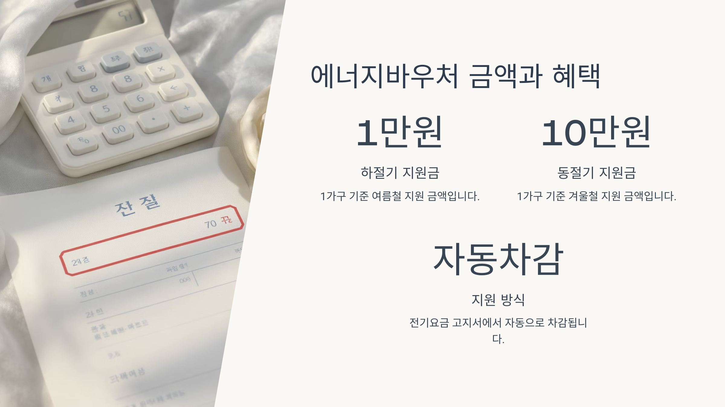 올해 기준 여름 바우처는 1인 가구 기준 약 9천 원, 겨울 바우처는 약 10만 원 이상이 지급돼요. 하지만 중복 지원은 되지 않고, 한 가구 한 명만 신청할 수 있어요.