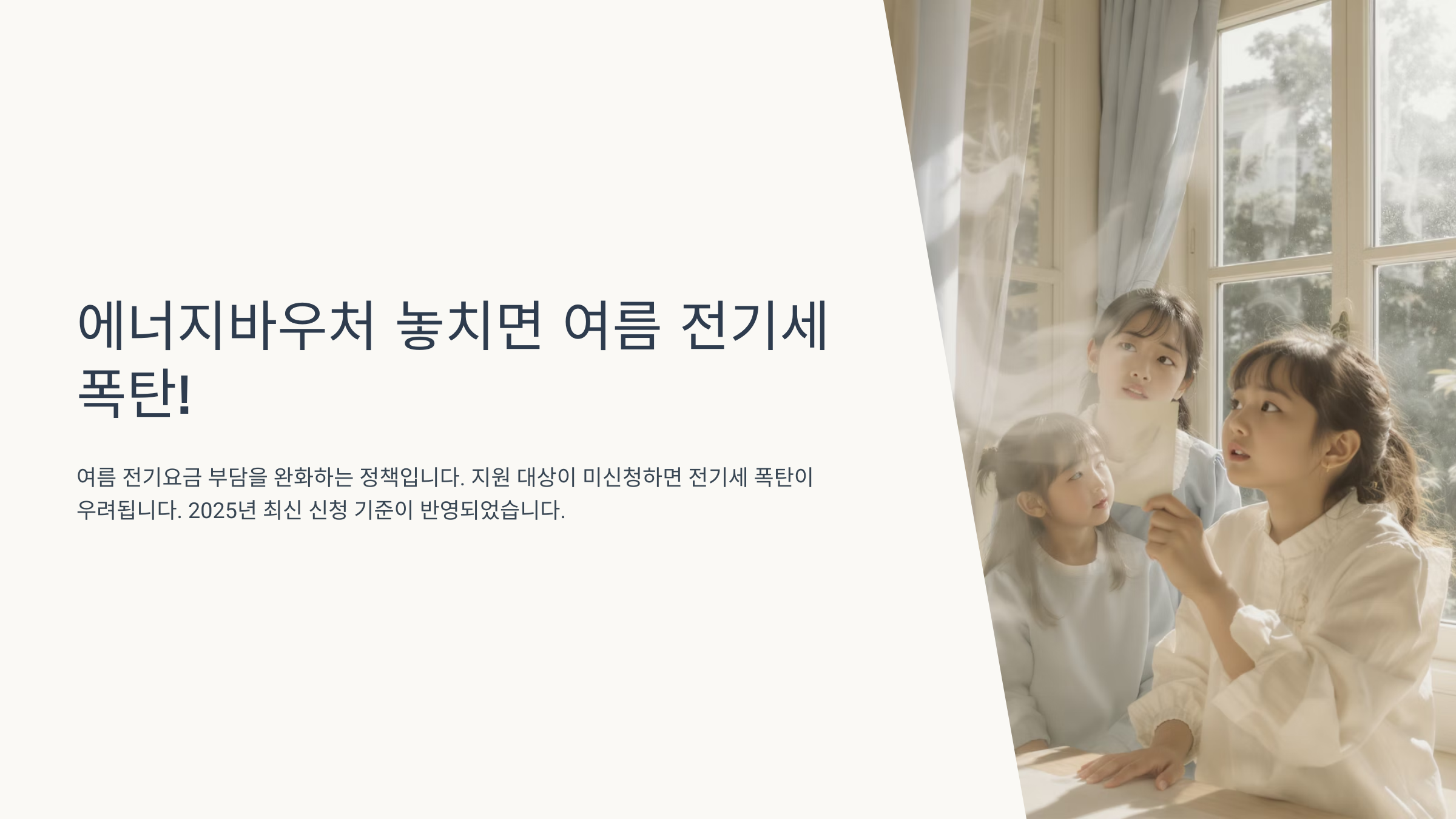 전기세, 난방비로 가계가 휘청이는 계절이 다가오면 걱정이 앞서죠. 특히 에너지 사용량이 많아지는 여름철엔 전기요금 폭탄이 현실이 되곤 해요. 그럴 때 꼭 알아둬야 할 게 바로 ‘에너지바우처’랍니다! 🌞