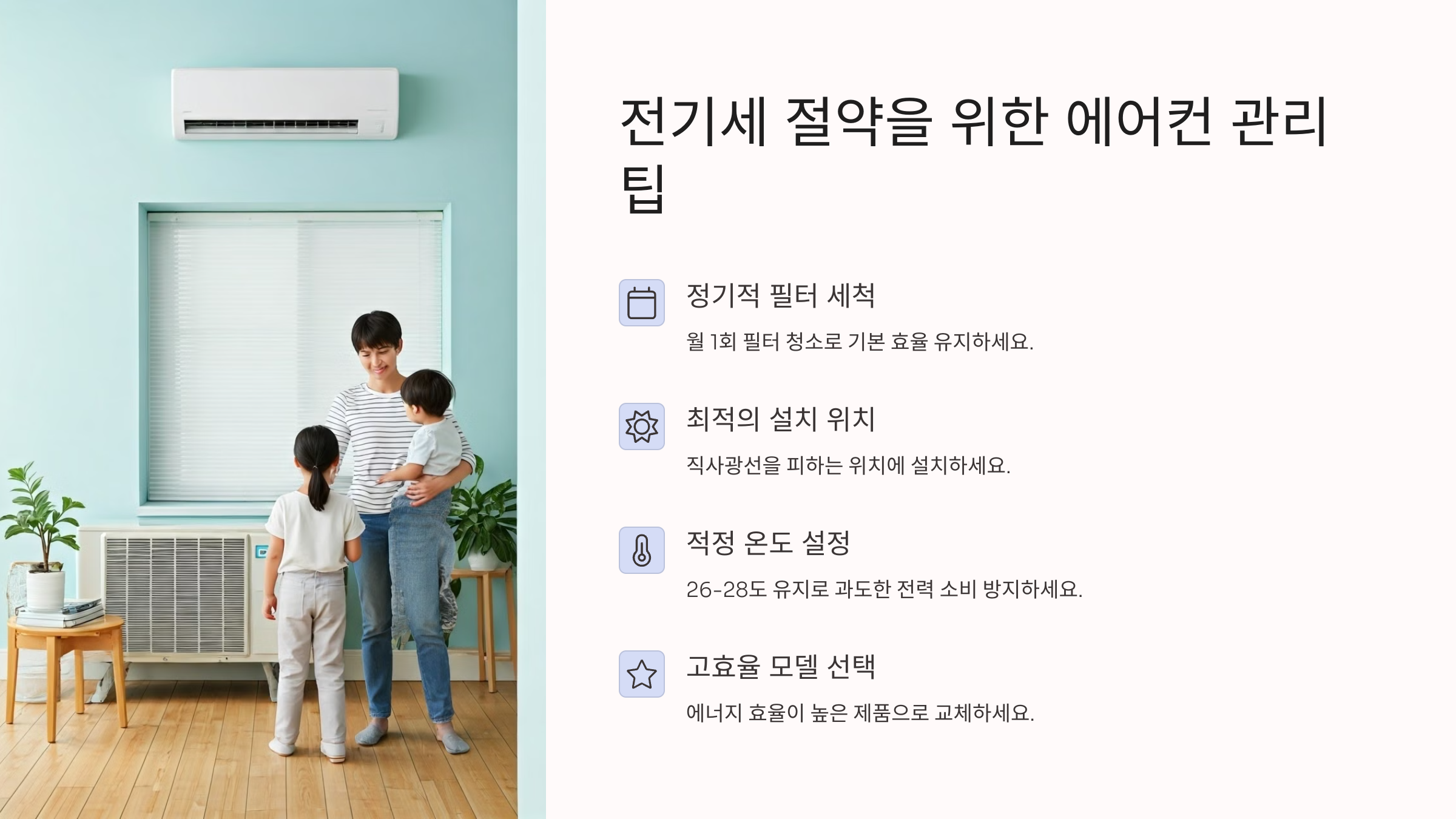 그리고 전기세 절감은 단지 ‘돈 아끼기’에만 그치지 않아요. 에어컨의 수명을 연장시키고, 고장률도 줄여주고, 우리 건강에도 훨씬 더 좋은 공기를 공급하게 돼요. 그야말로 일석삼조 효과!