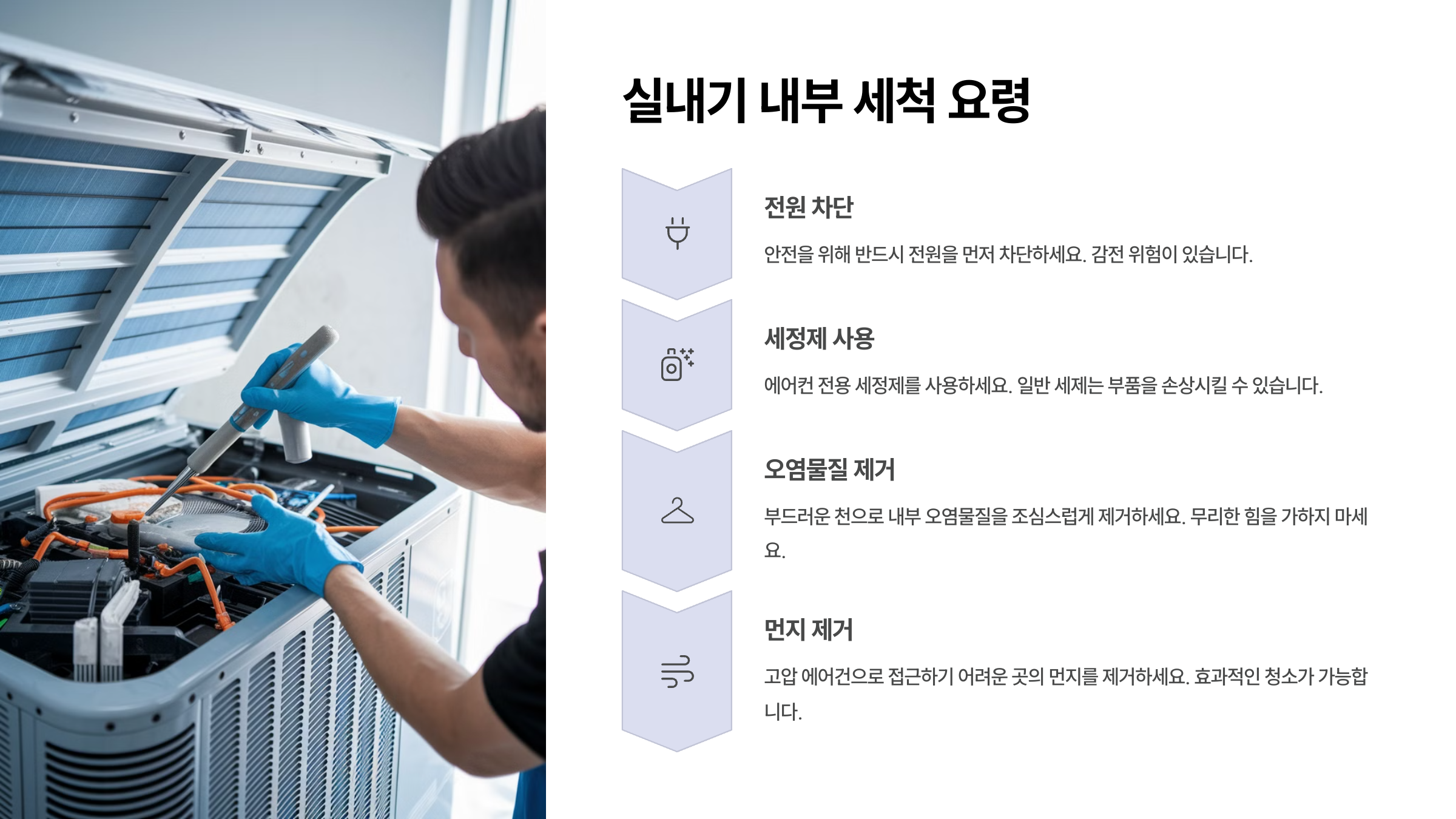 다음 단계에서는 실내기 내부 청소로 넘어가요. 겉만 깨끗하면 소용없으니까요! 내부 청소가 왜 중요한지도 알려줄게요!