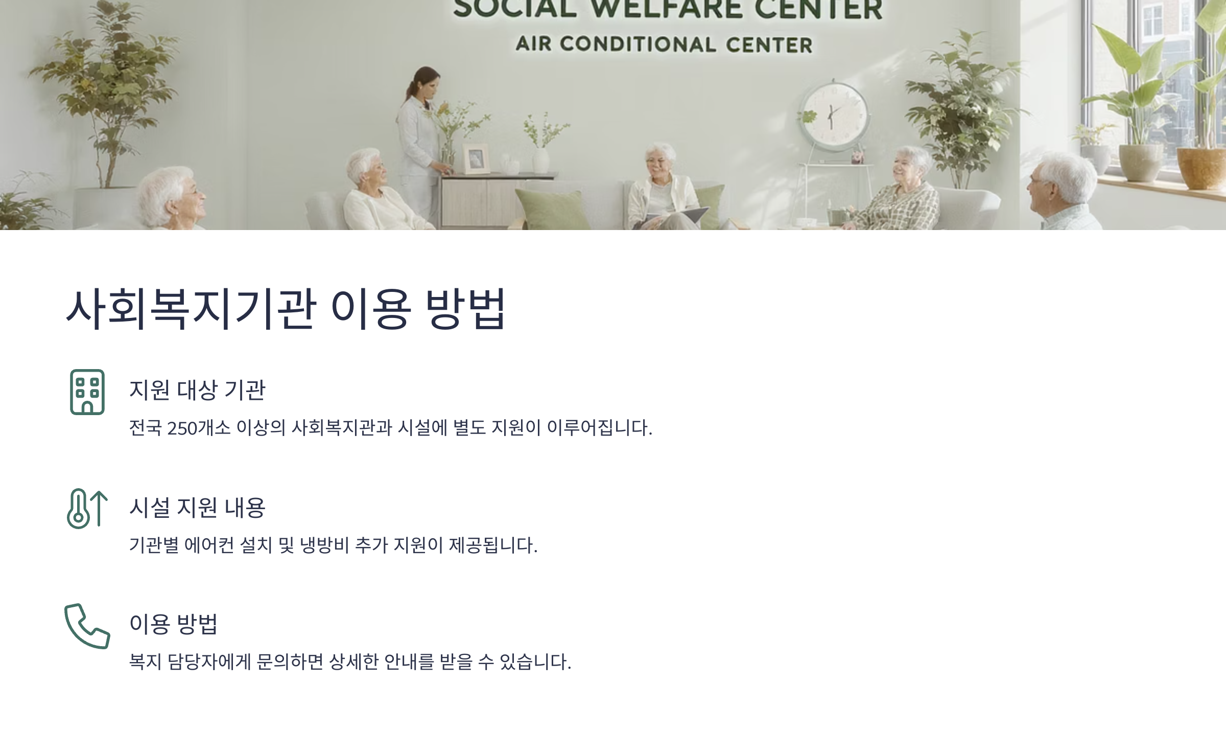 에너지바우처 외에도 지역 복지기관을 통해 냉방 지원을 받을 수 있어요. 특히 고령자, 장애인, 아동 가구는 복지관 냉방실, 무더위 쉼터 등 복지 공간을 적극 이용하는 게 좋아요.