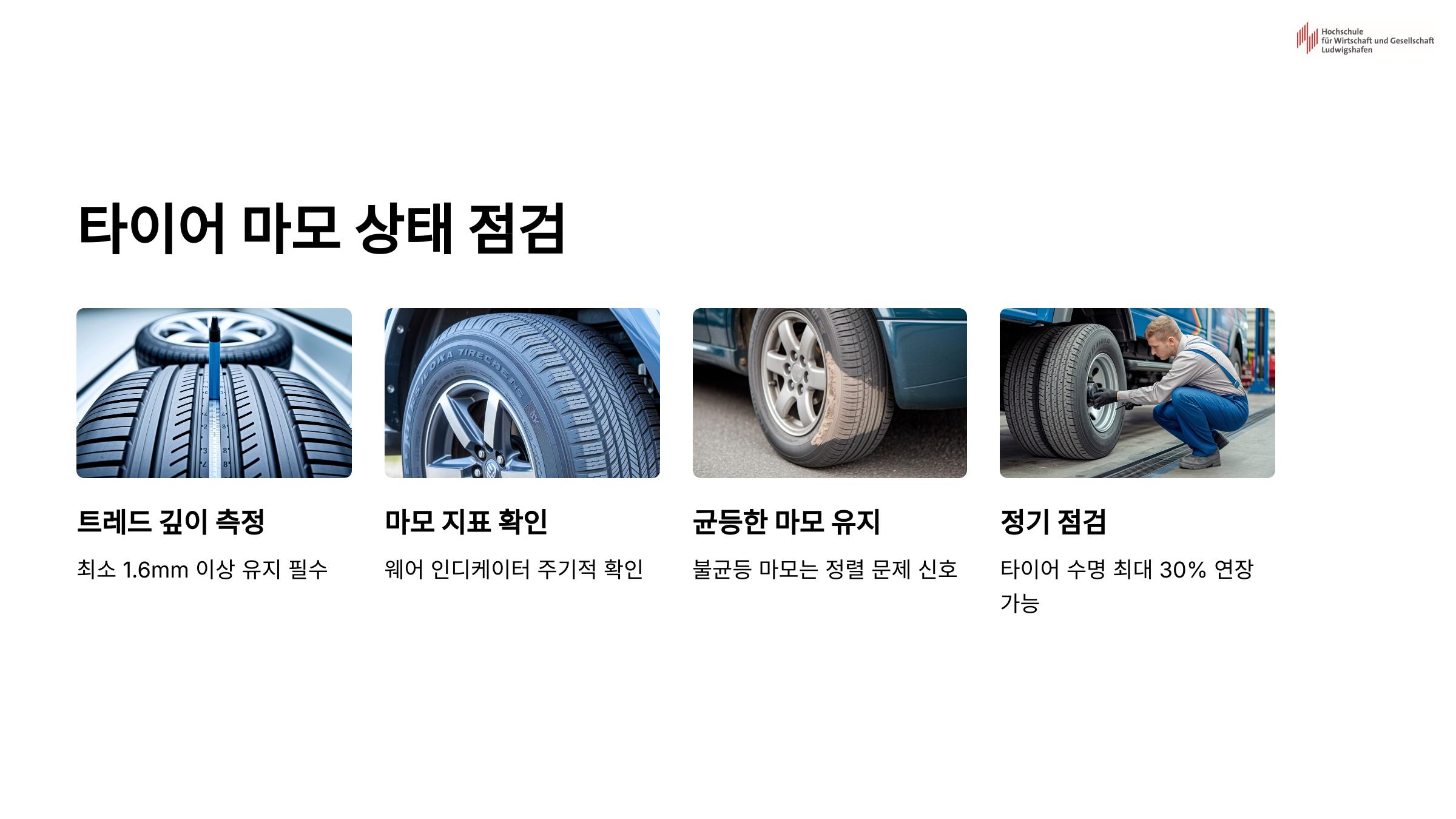 그리고 마모가 한쪽으로만 심한 경우는 차량 정렬 상태가 좋지 않거나, 서스펜션 문제일 수 있어요. 이런 경우엔 단순 교체보다도 먼저 정비소에서 정렬 상태부터 점검받는 게 좋아요.
