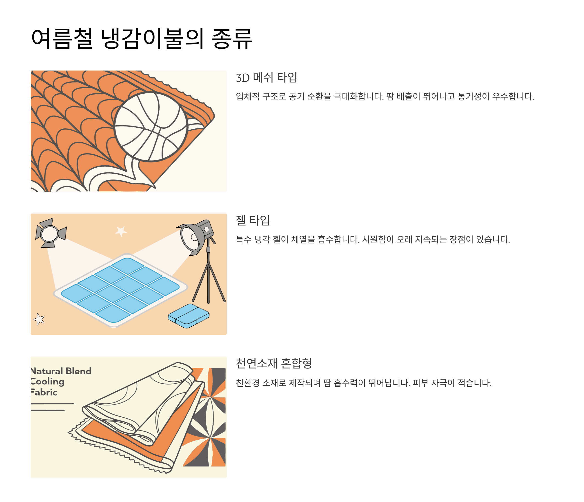 | 종류 | 소재 | 시원함 정도 | 활용도 |