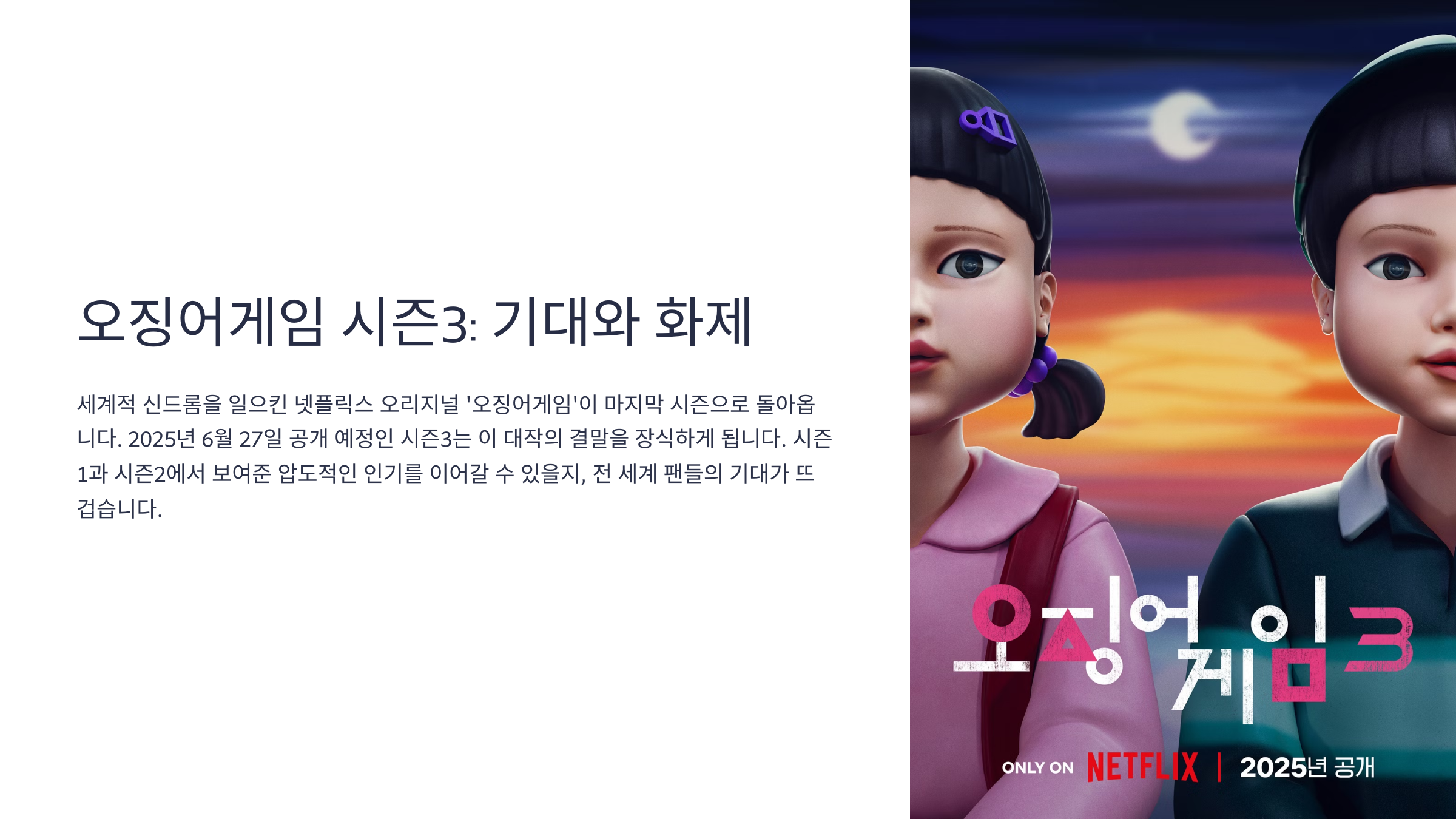 넷플릭스를 통해 세계적인 돌풍을 일으킨 드라마 🎬 오징어게임이 시즌3로 돌아온다는 소식에 많은 팬들의 기대감이 고조되고 있어요. 앞선 시즌들이 사회의 어두운 이면과 인간의 본성을 적나라하게 보여주며 전 세계 시청자들의 폭발적인 반응을 이끌어냈죠.