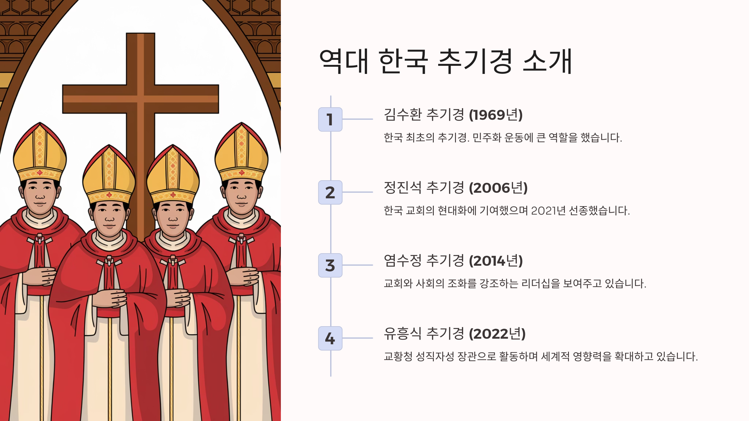 이제 다음으로는 역대 한국 추기경들을 간단하게 소개해볼게요. 그들의 업적과 교회 내 위치가 한국 교황 탄생의 기초가 되었어요.