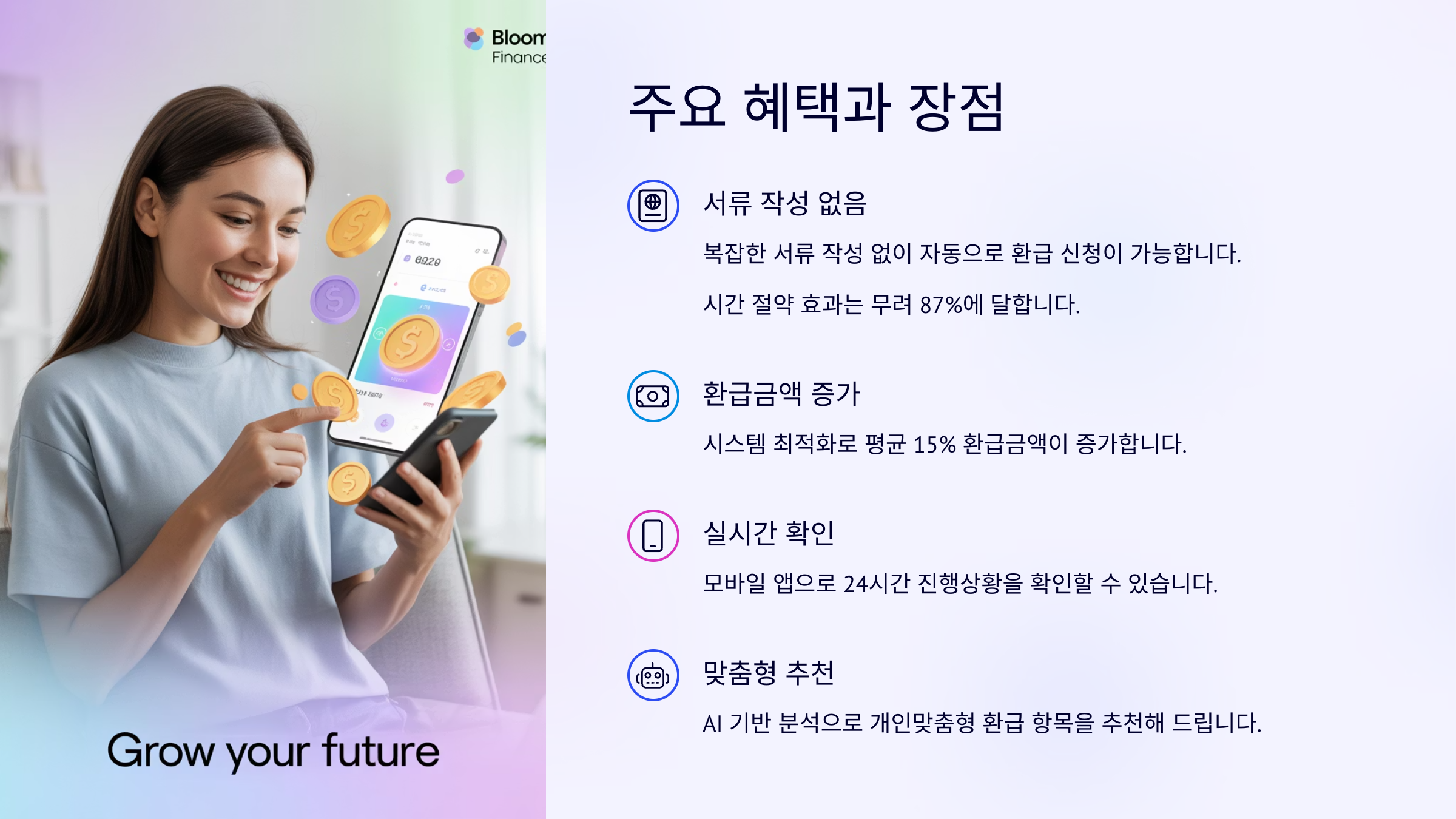 두 번째는 '정확성'이에요. 세무사 없이도 AI 기반 자동 계산 시스템이 정확한 환급액을 알려주고, 누락 없이 꼼꼼히 환급받을 수 있도록 도와줘요. 이 과정에서 오류나 실수가 발생할 확률도 훨씬 줄어들게 되죠.