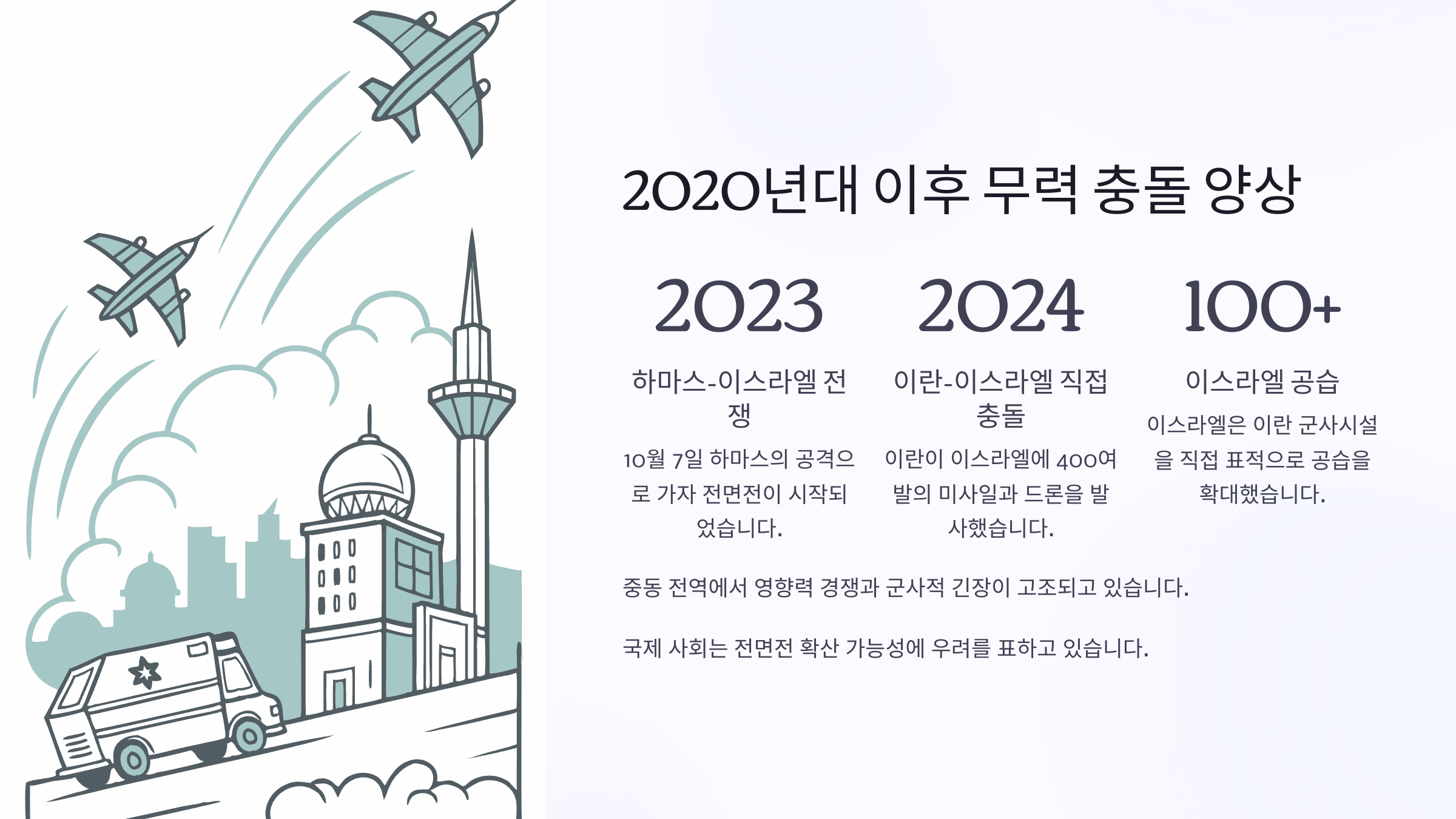 2020년대를 맞이하며 이스라엘·이란·미국 간의 긴장은 점차 현실적인 무력 충돌로 이어지고 있어요. 특히 2023년부터는 하마스와 이스라엘 사이의 전면전, 그리고 이란의 지원 의혹이 맞물리면서 세 나라 모두의 군사적 대응이 점점 수위를 높였어요. 단순한 외교적 충돌을 넘어서, 전면전의 그림자도 짙어졌죠.