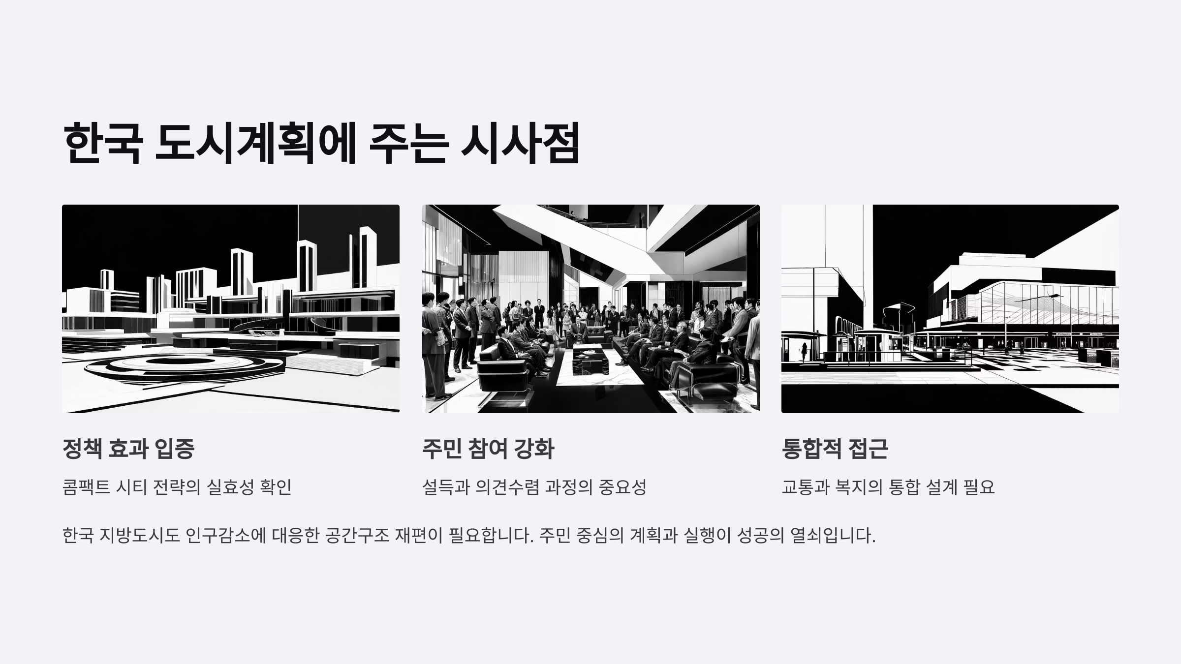 이제 마지막으로, 이 사례가 한국 도시계획에 어떤 시사점을 주는지 정리하고, FAQ로 마무리할게요!