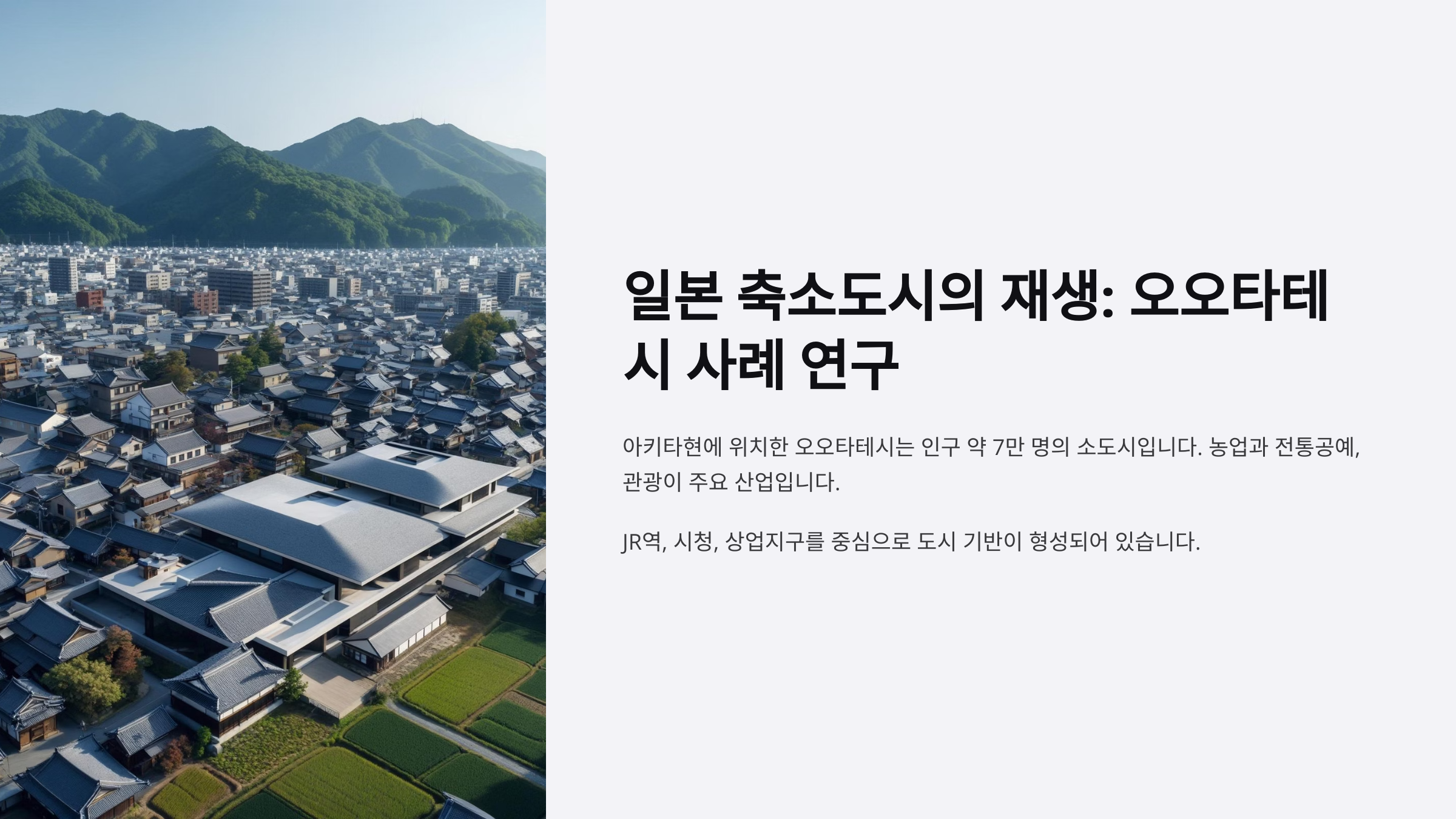 오오타테시의 사례는 인구가 줄어드는 시대, 도시계획이 ‘확장’이 아닌 ‘집약’과 ‘선택’으로 방향을 틀어야 한다는 것을 잘 보여줘요. 도시 전체를 유지하려는 고집보다는, 필요한 핵심을 지키는 것이 더 현명한 전략일 수 있어요.
