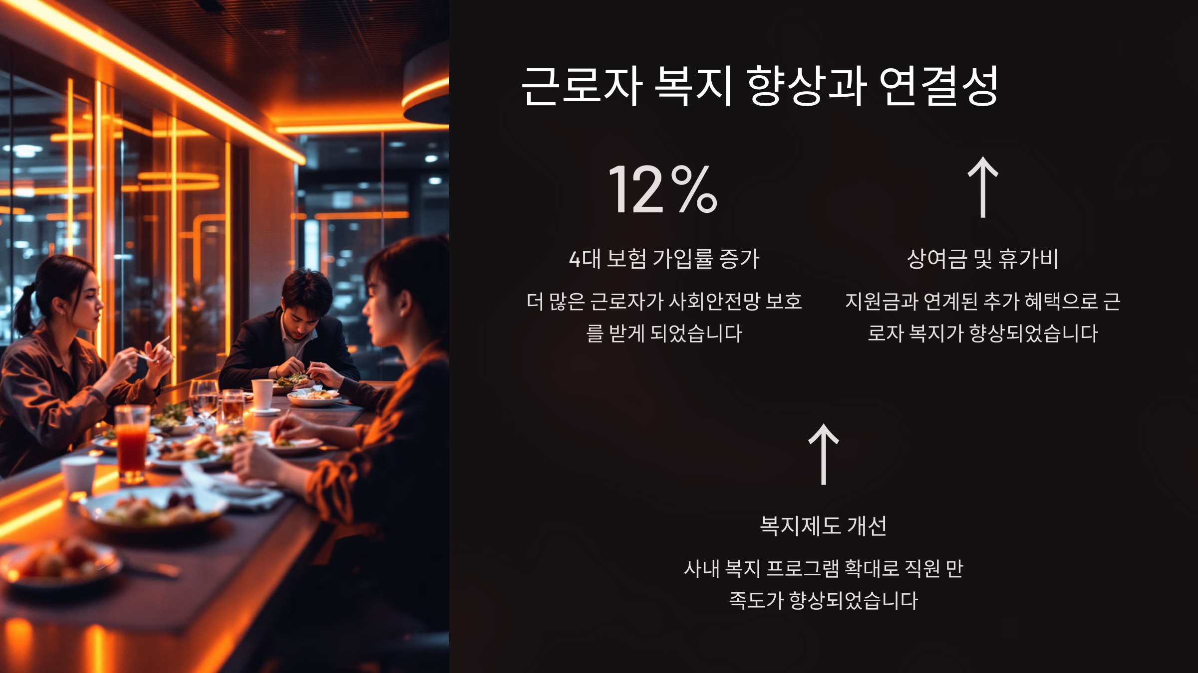 | 장기근속 유도 | 복지 향상으로 이직률 감소 | 업무 연속성 확보 |