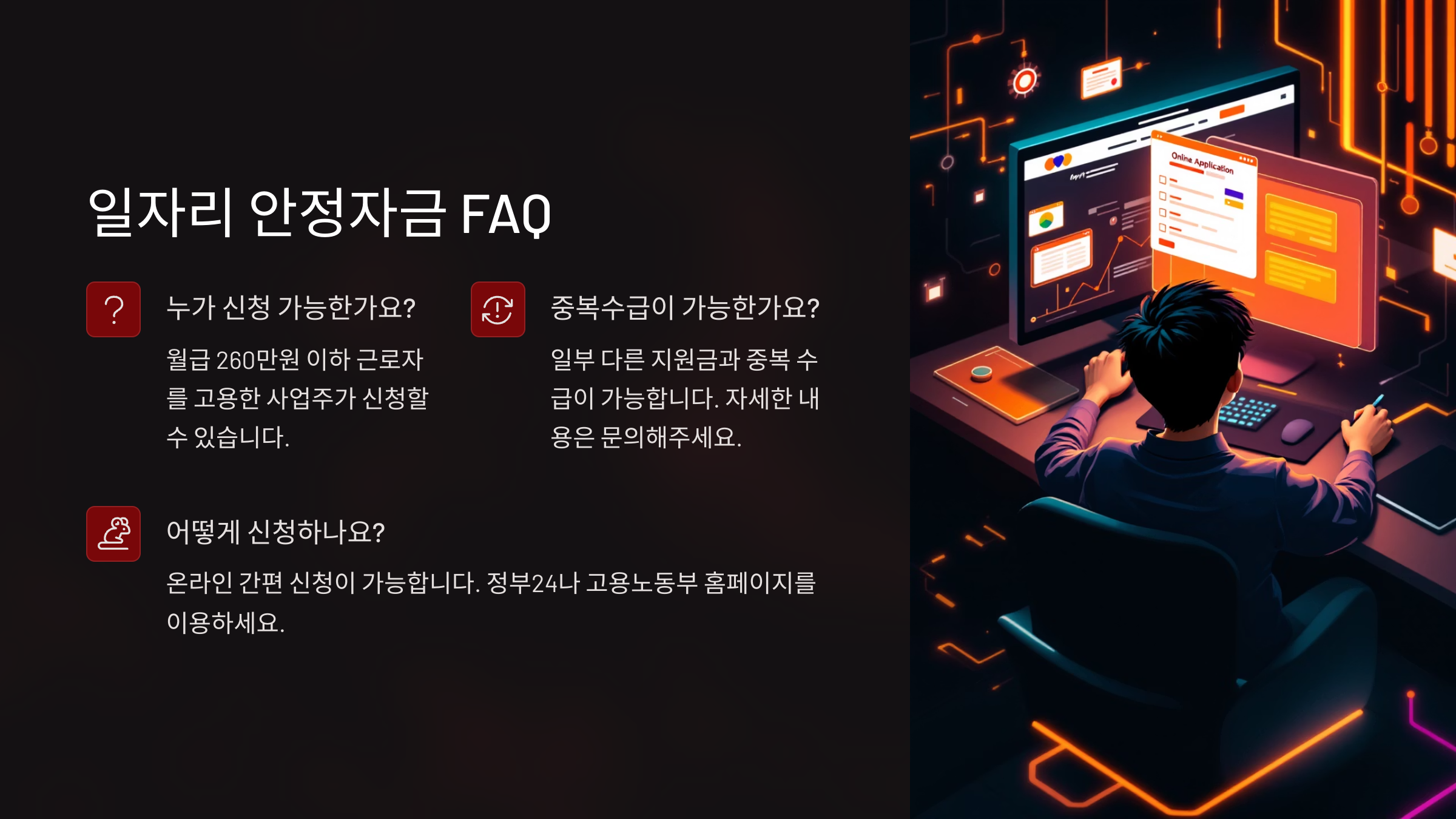 A3. 고용노동부 홈페이지 또는 각 지방고용노동청을 통해 신청할 수 있고, 일자리 안정자금 수급 이력이 있으면 우선 고려돼요.
