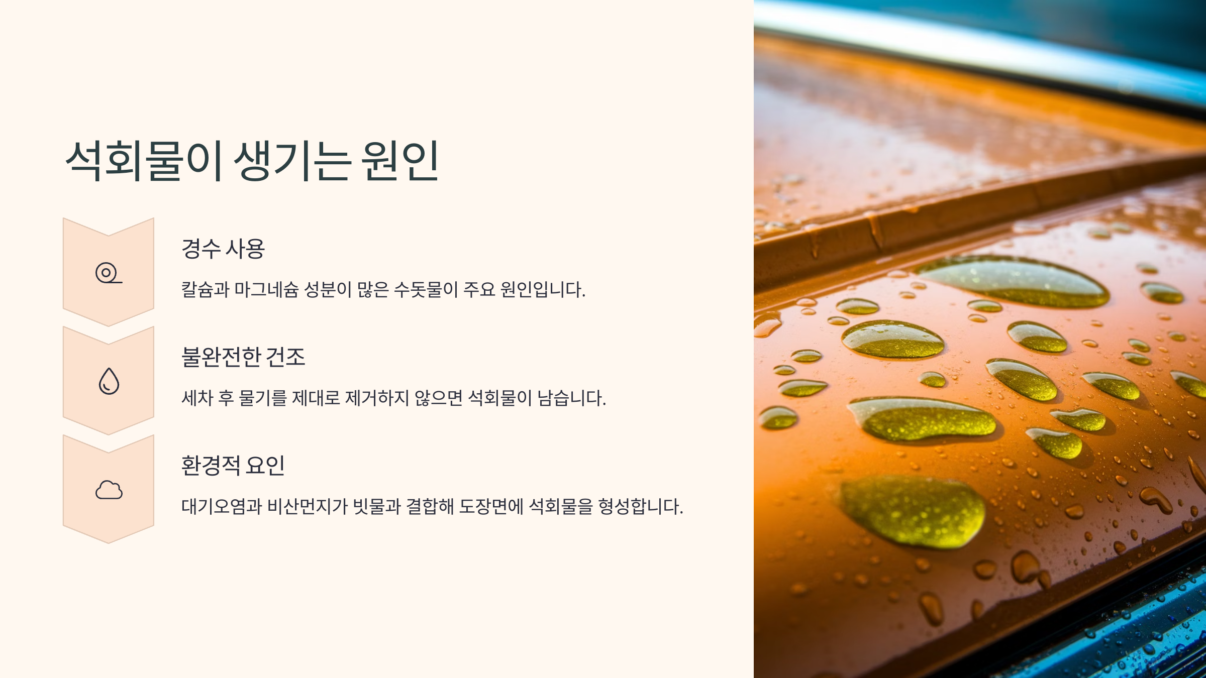 특히 여름철엔 햇볕 아래 차량이 뜨겁게 달궈진 상태에서 물이 증발하면 석회물 성분만 도장면에 남아 도장면을 산화시키는 원인이 되기도 해요. 물 얼룩이 자주 생기는 환경이라면 석회물이 누적될 가능성도 높아요.