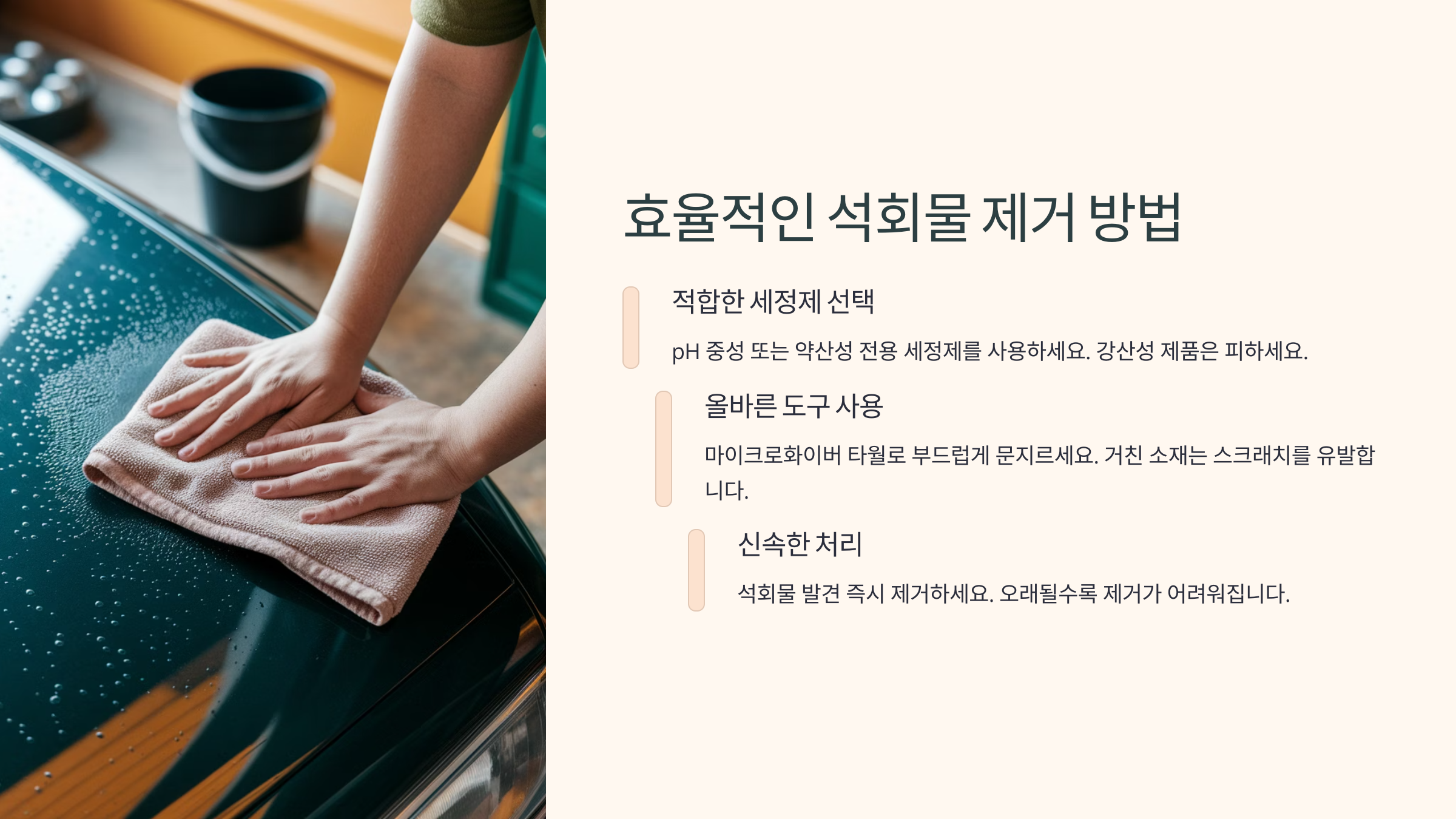 자동차 석회물 제거는 '자극 없이, 효과적으로'가 핵심이에요. 특히 도장면 손상을 피하면서 석회 자국을 말끔히 지우려면, 강한 화학 성분보다는 차량 전용 제품을 사용하는 게 안전해요. 기본적으로는 약산성 제품이 석회물에 효과적이에요.